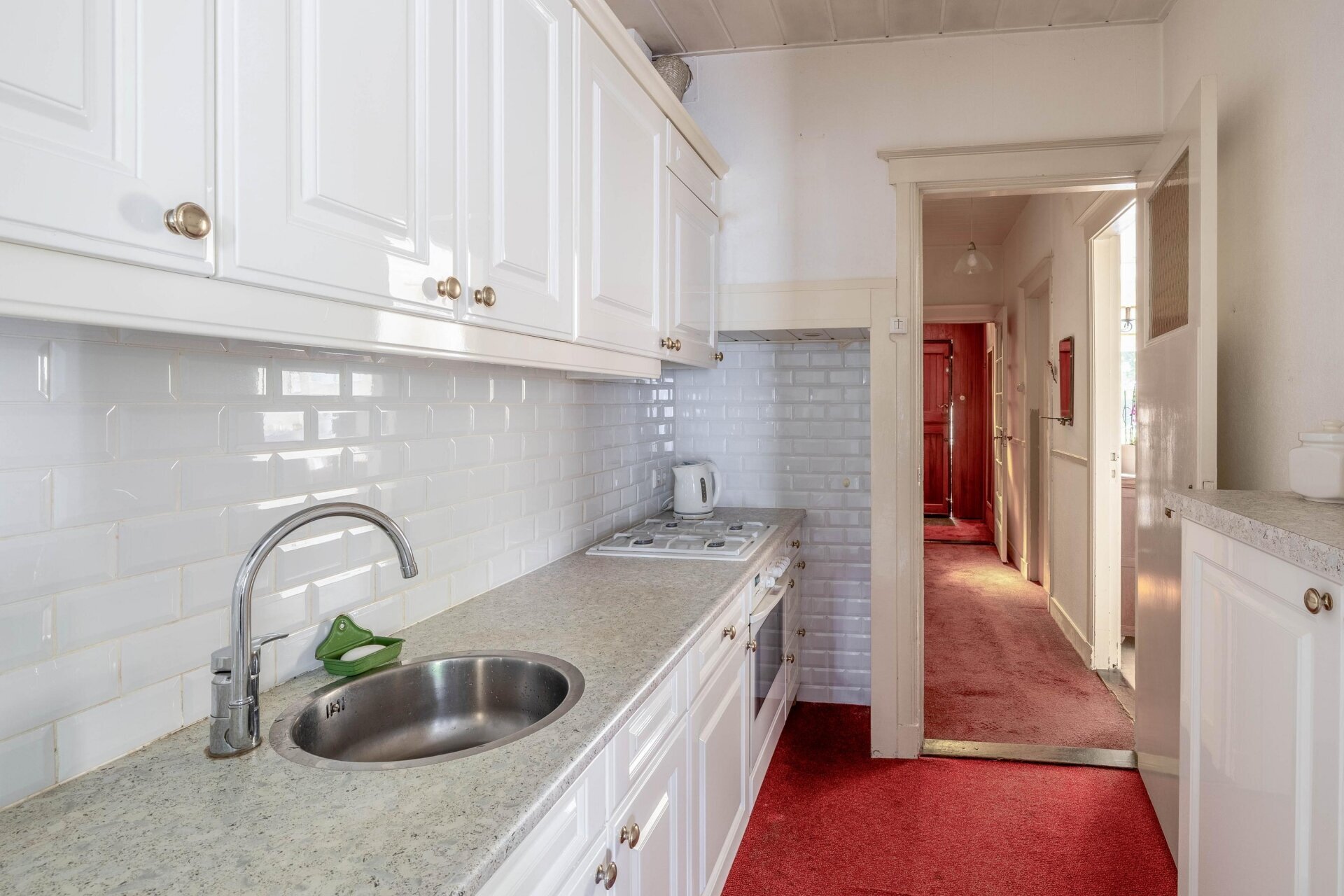 Bij binnenkomst in de hal voel je direct de sfeer van het huis. De woonkamer is licht en heeft nog originele elementen, zoals de erker aan de voorzijde die zorgt voor extra lichtinval en karakter. Er is plek voor een comfortabele zithoek en eettafel, en via de keuken met een verzorgde keukeninrichting loop je zo naar de serre aan de achterzijde met toegang tot de tuin. De afwerking is gedateerd, maar wie hier doorheen kijkt ziet meteen het potentieel: een lichte leefruimte met mooie basis.