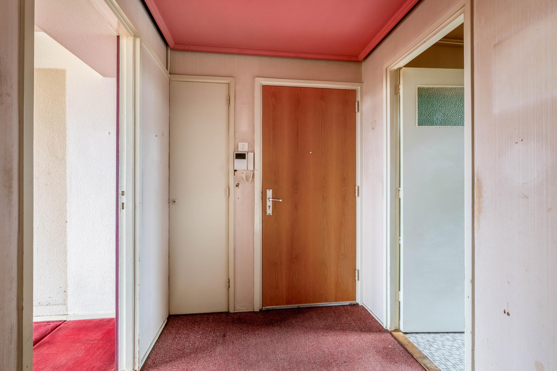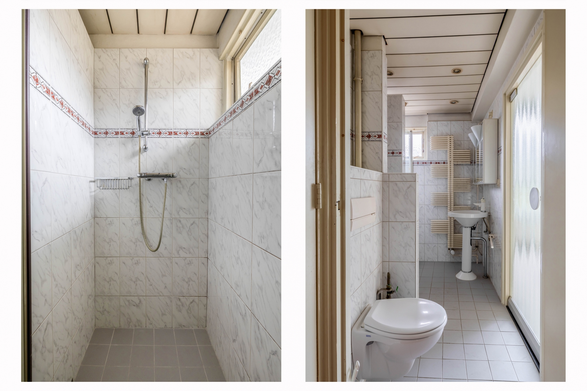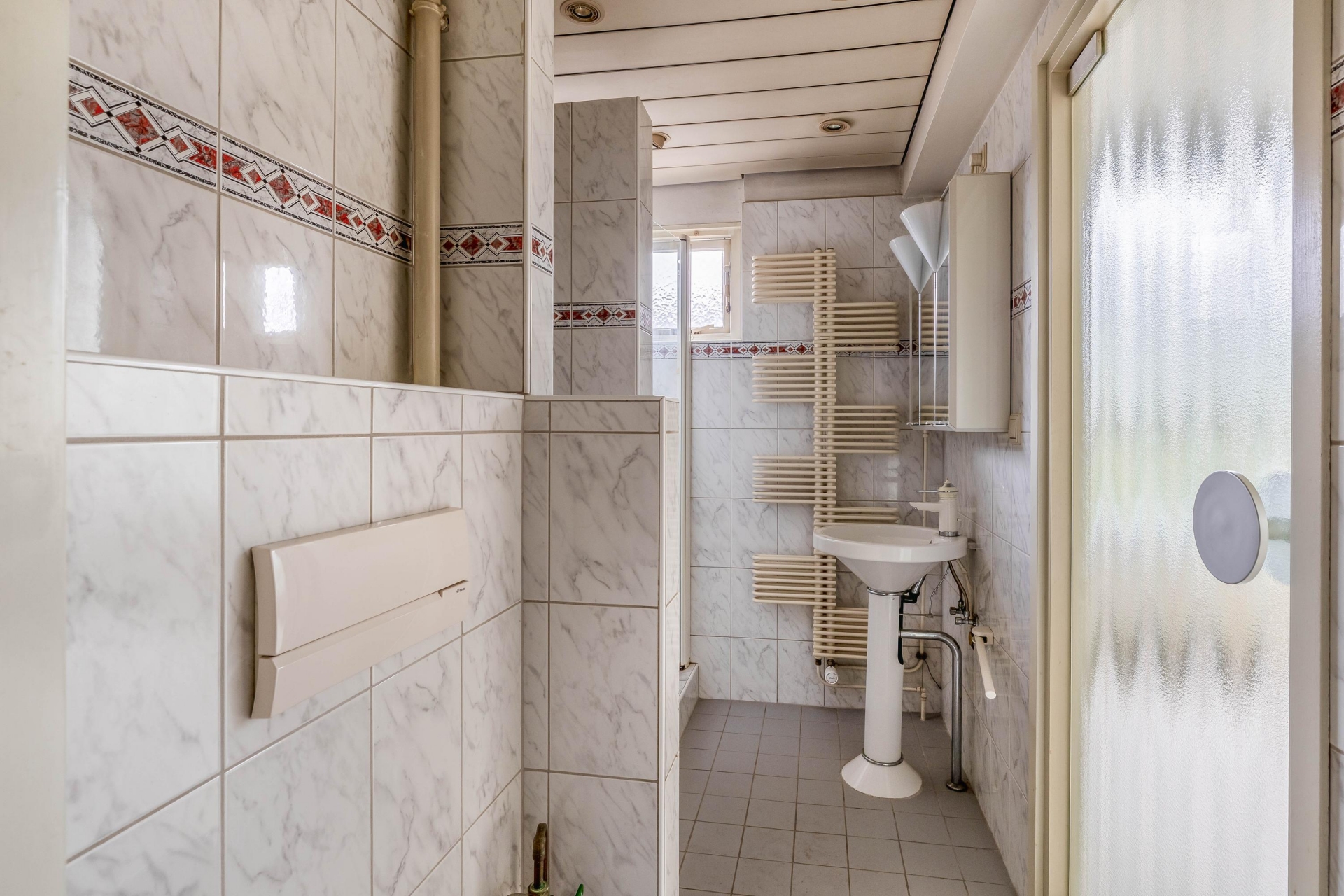 Het appartement beschikt verder over een badkamer met toilet. Ook hier geldt: de basis is aanwezig, maar er is ruimte om het geheel naar deze tijd te brengen.
