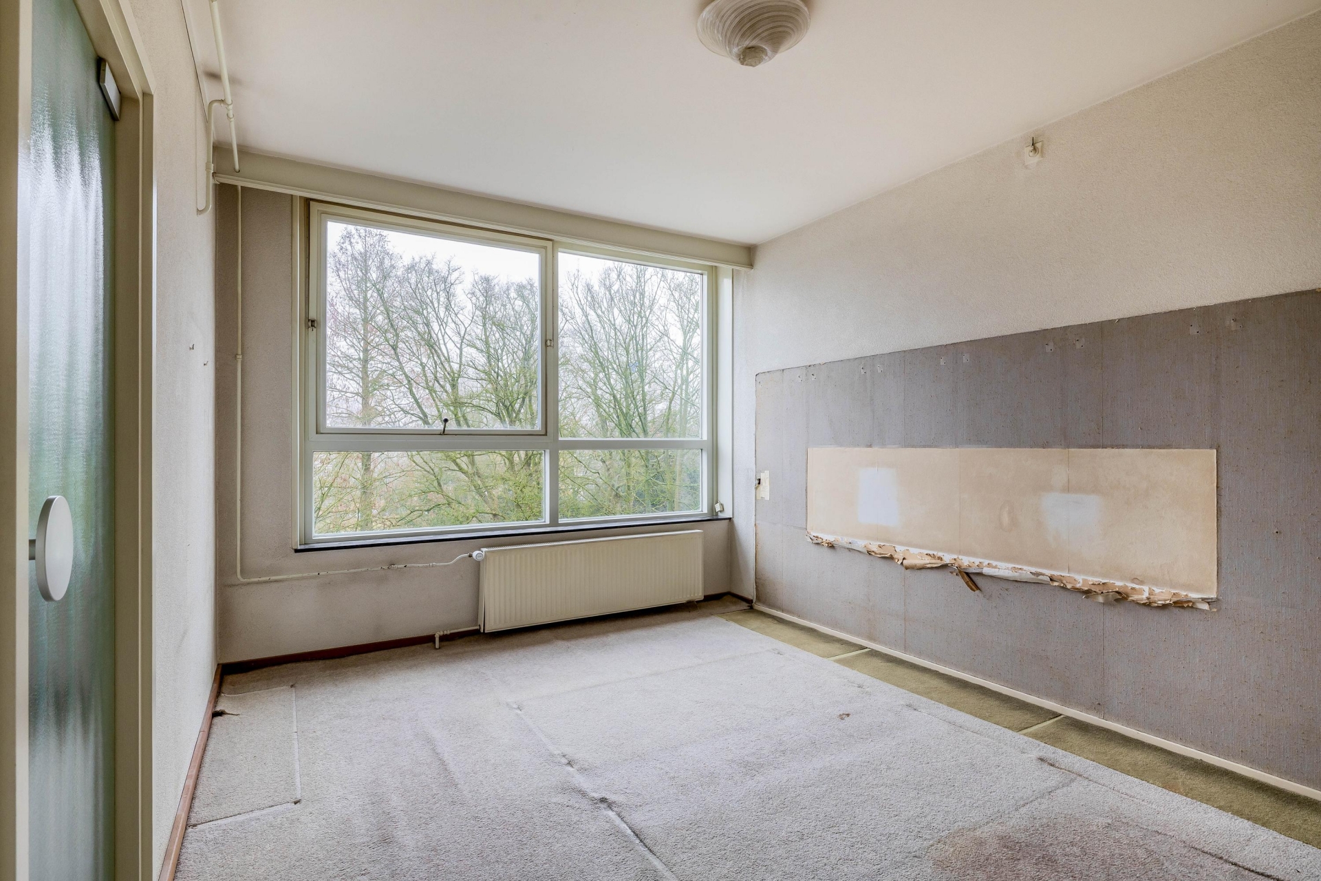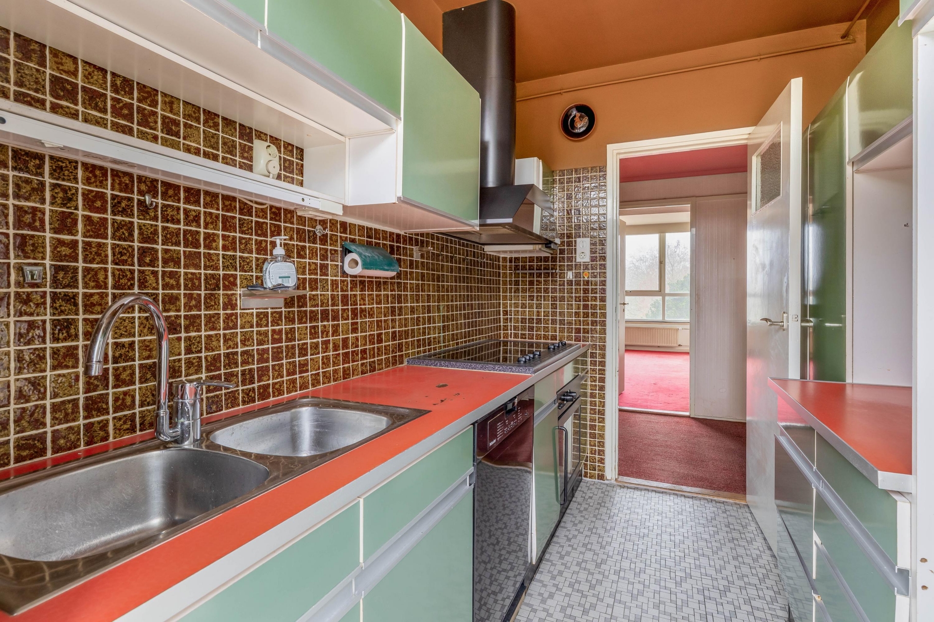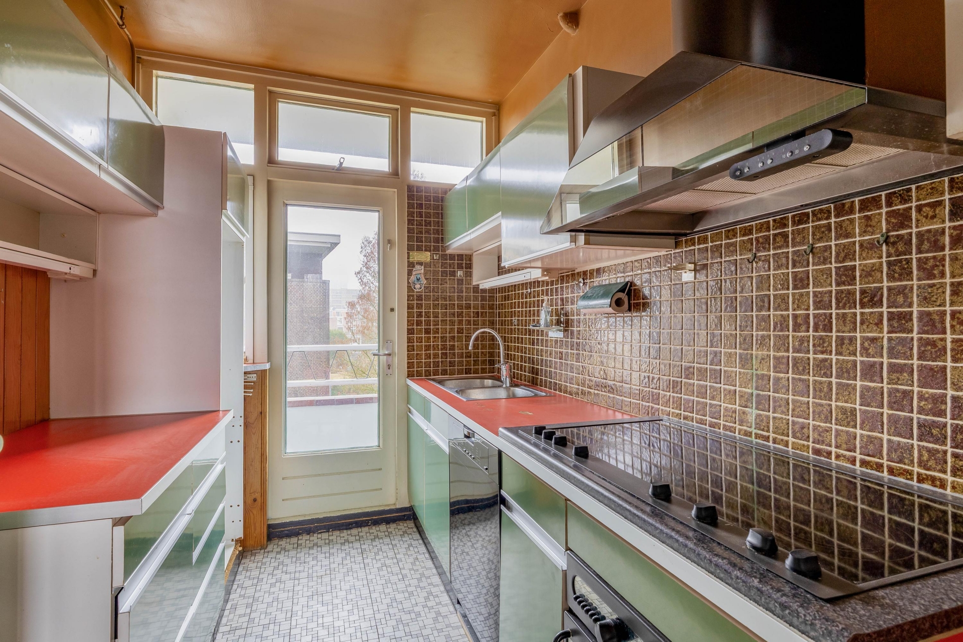 De keuken bevindt zich eveneens aan de achterzijde en biedt toegang tot een tweede balkon. De huidige inrichting is gedateerd, maar dat is juist de kans. Hier kun je volledig naar eigen smaak moderniseren en indelen.