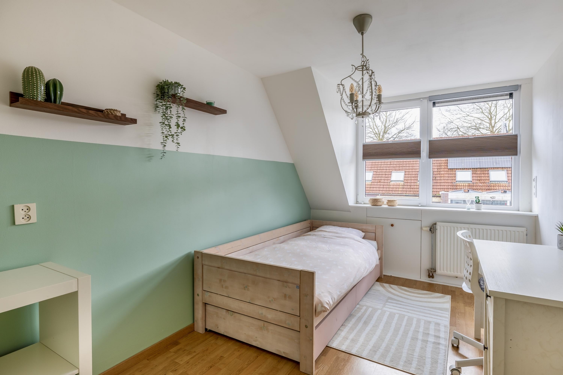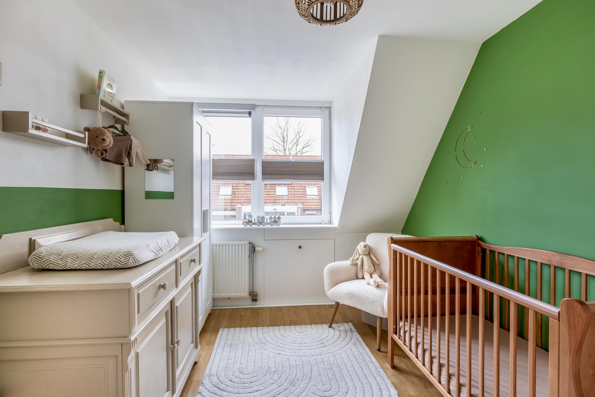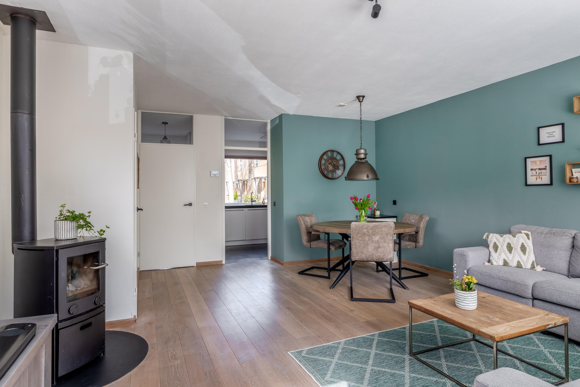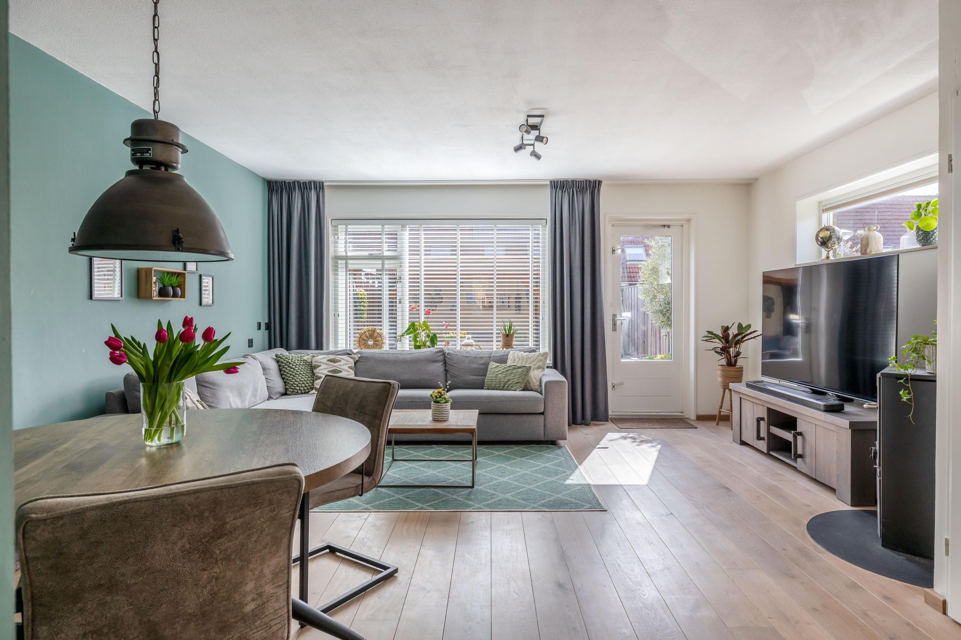 De zithoek is ruim opgezet en biedt voldoende plek voor een comfortabele bank en een gezellige eethoek. De rustige kleuren en verzorgde afwerking maken dat je hier eigenlijk direct kunt intrekken zonder grote aanpassingen. Dit is zo’n huis waar je binnenkomt en denkt: dit klopt gewoon.