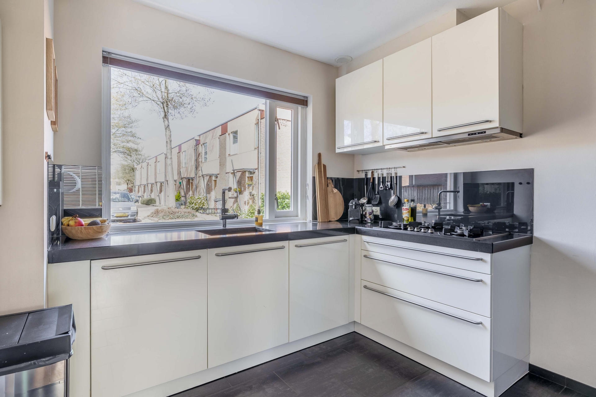 Aan de voorzijde van het huis ligt de dichte keuken. Deze is praktisch ingericht en voorzien van diverse inbouwapparatuur, waardoor je hier alles bij de hand hebt om lekker te koken. Het grote raam zorgt voor prettig lichtinval en een vrij uitzicht op de straat.