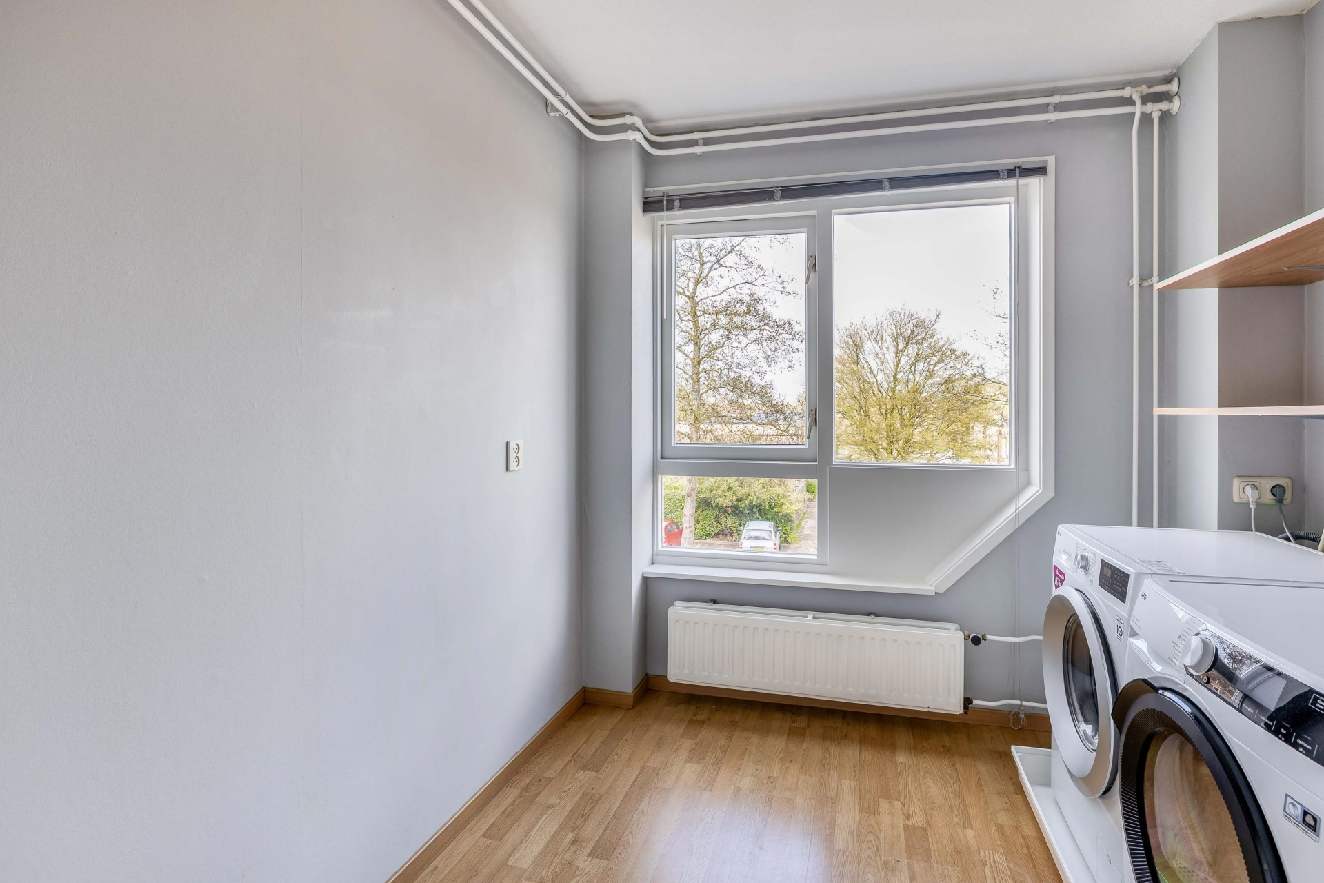 De tweede verdieping biedt nog eens twee kamers. Eén van deze kamers is momenteel ingericht als wasruimte, maar kan eenvoudig worden gebruikt als extra slaapkamer, werkplek of hobbyruimte. Ideaal voor wie flexibel wil omgaan met de beschikbare ruimte.