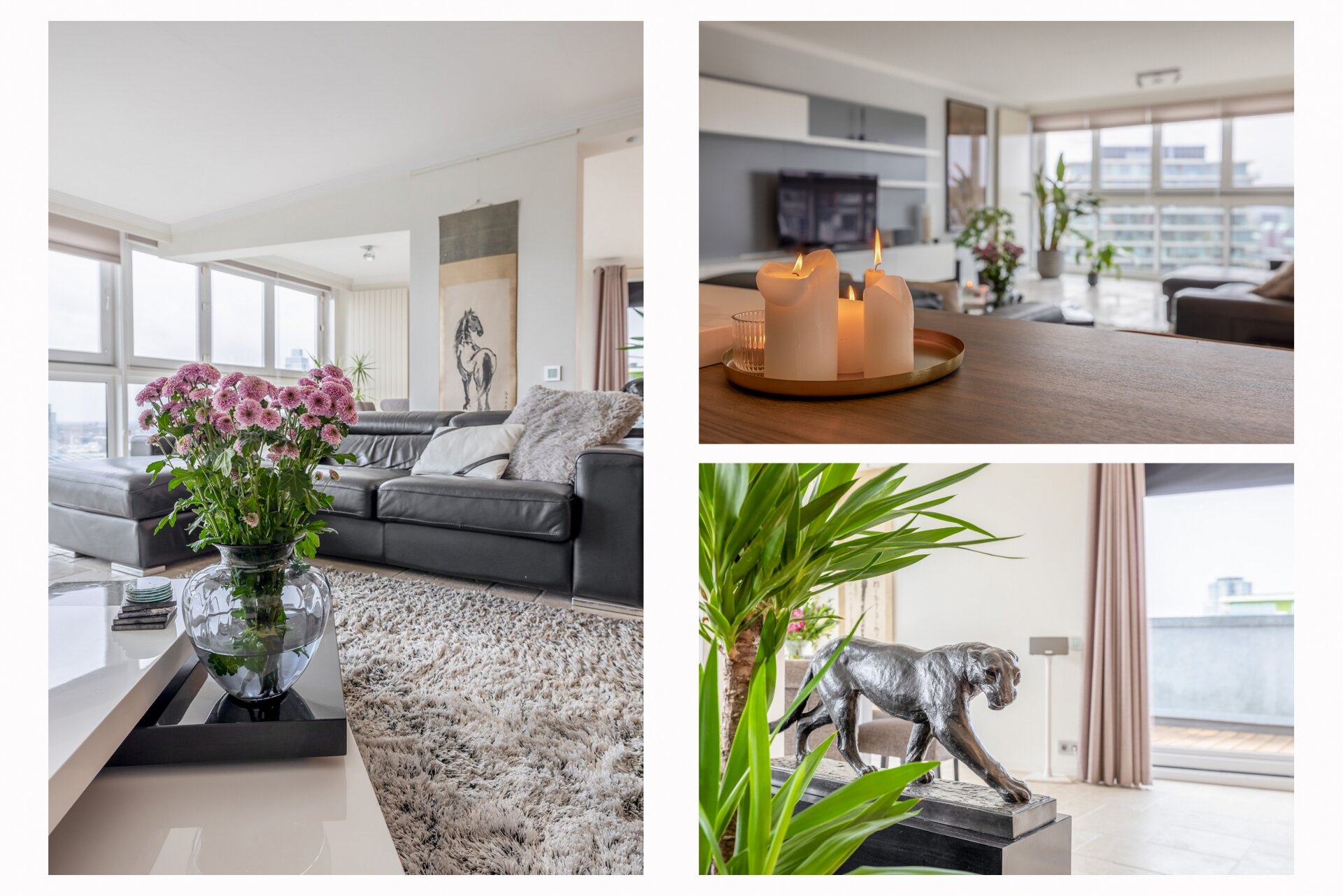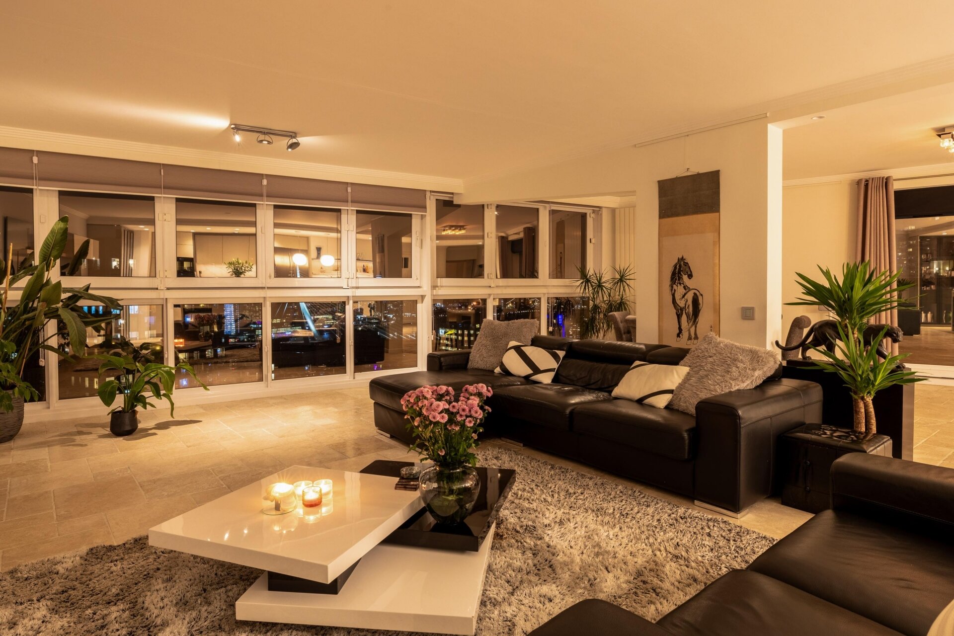 De royale living is een open, lichte ruimte die perfect aansluit bij het hoogwaardige karakter van het penthouse. De grote raampartijen rondom halen buiten naar binnen en zorgen voor een constante verbinding met de stad. De neutrale kleurstelling en de natuurstenen vloer geven het geheel een warme, luxe uitstraling.