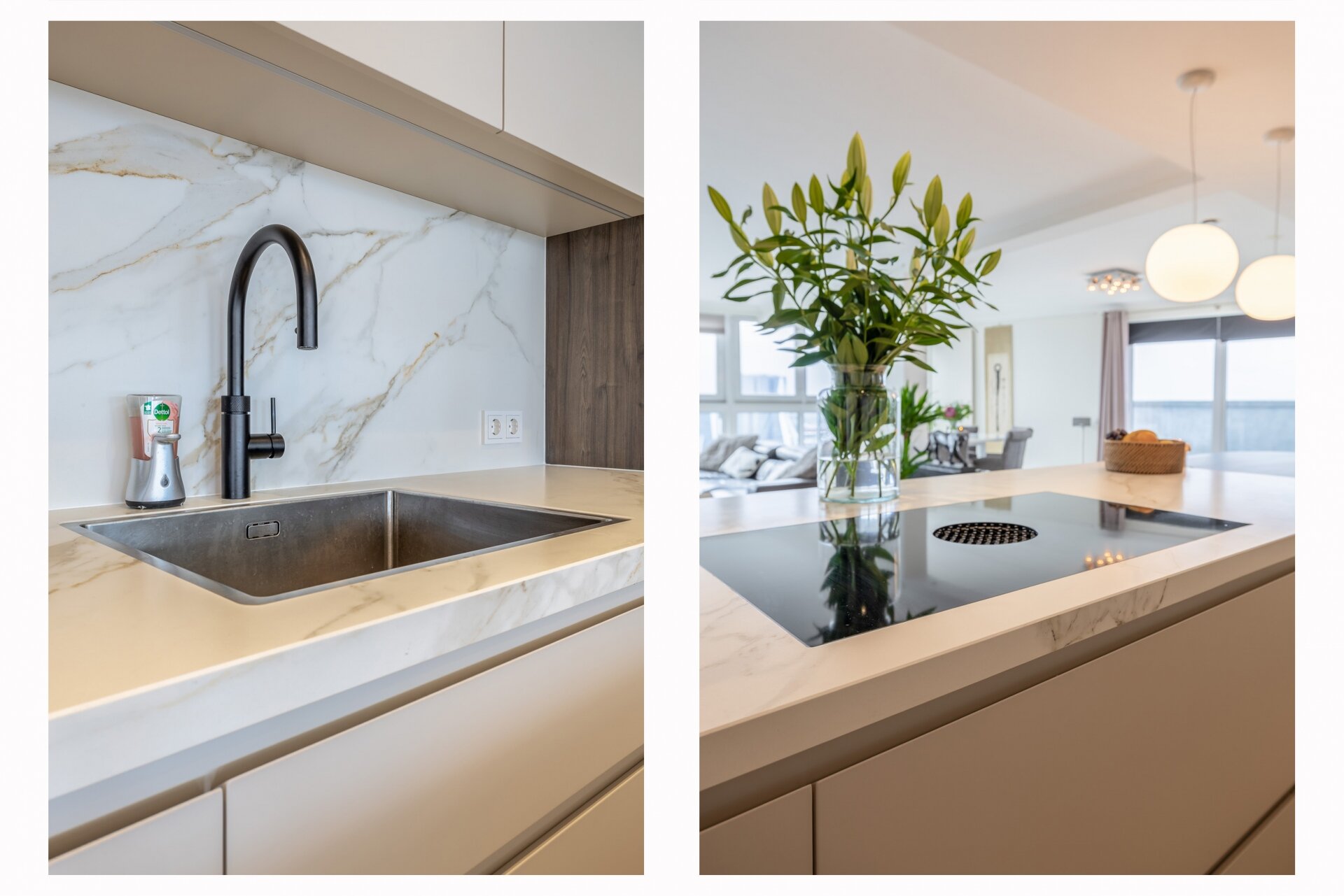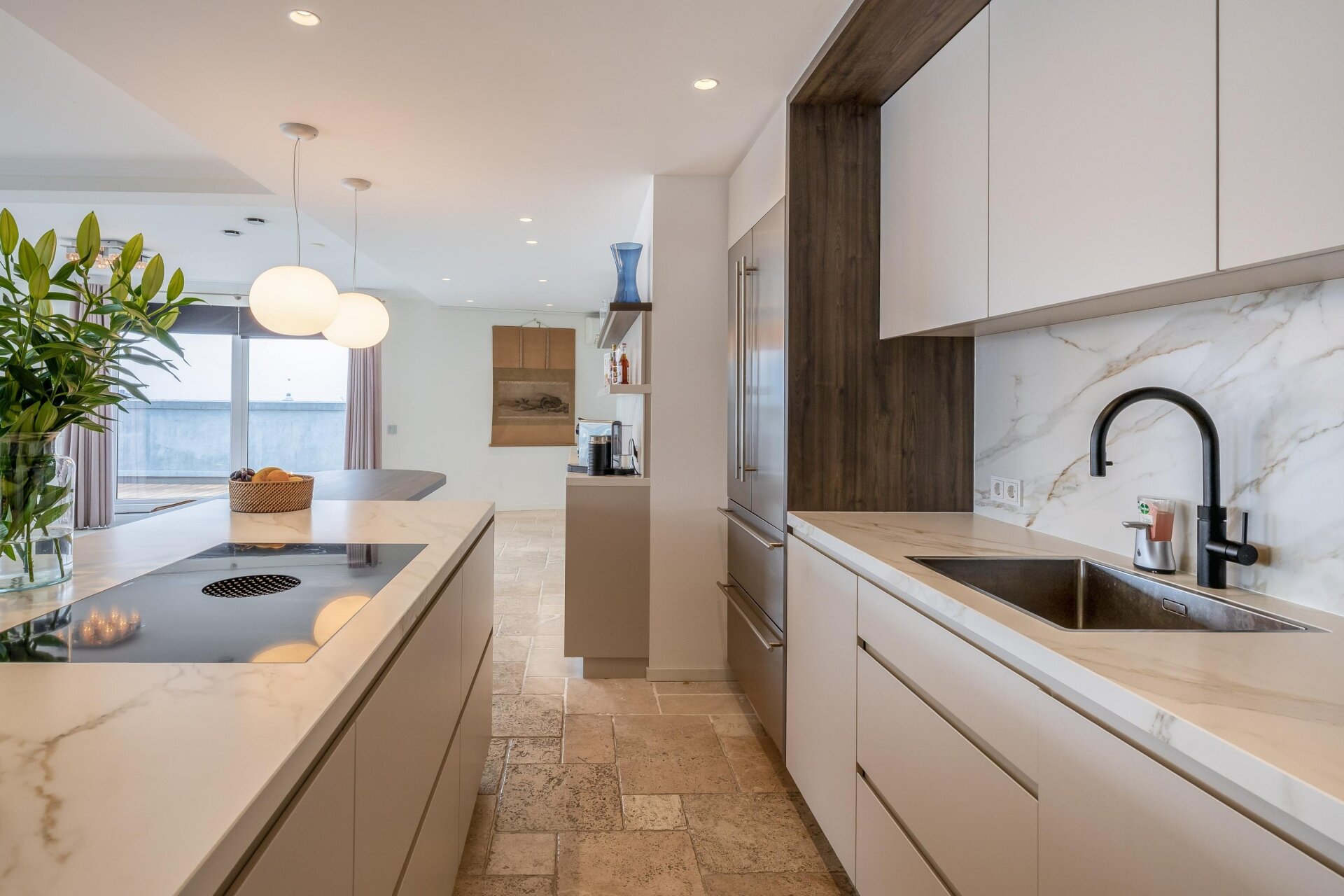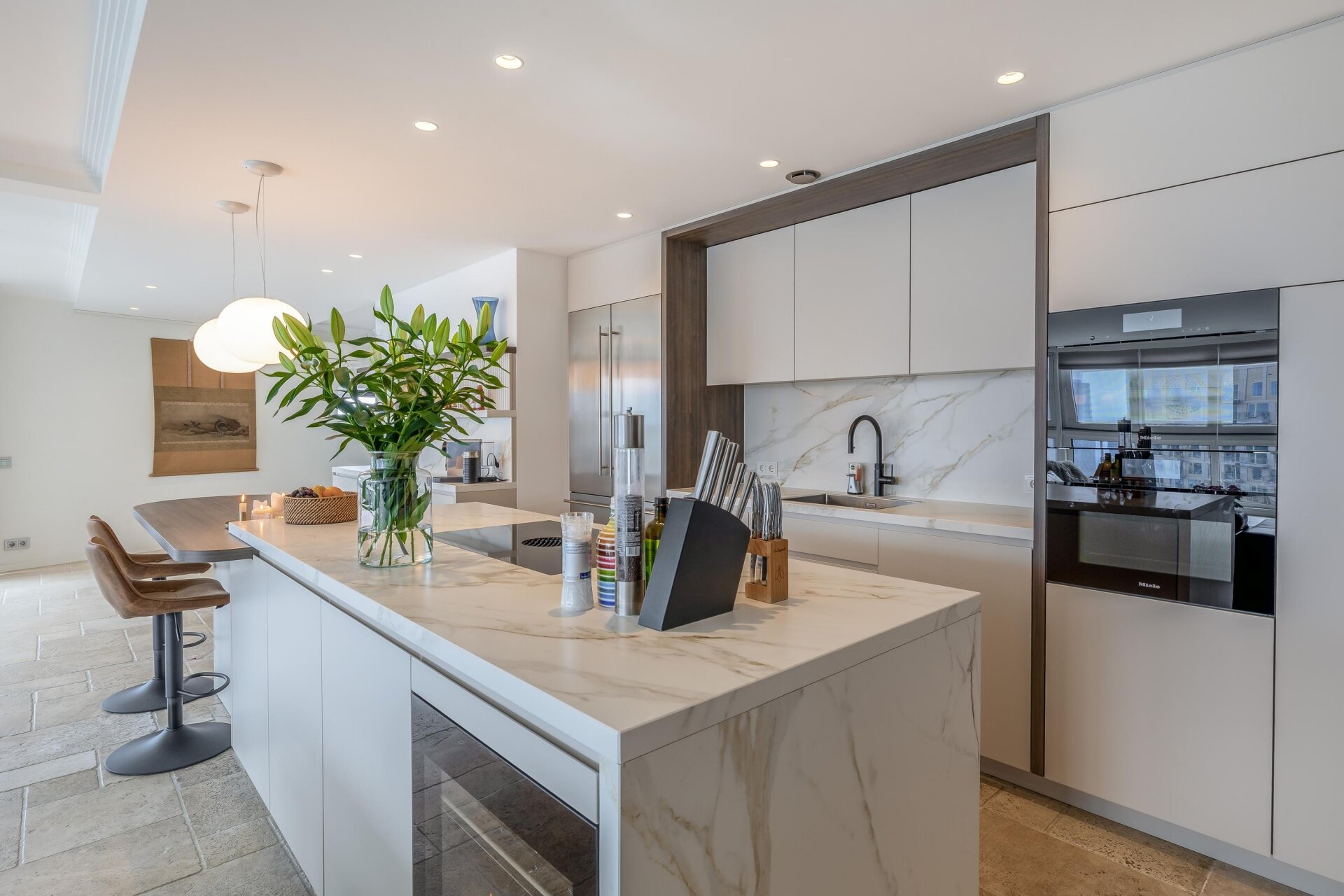 Centraal in de ruimte ligt de gloednieuwe keuken (2025): een echte blikvanger! Voorzien van een kookeiland, strakke marmerlook werkbladen, hoogwaardige inbouwapparatuur (Miele) en veel opbergruimte. Het eiland biedt bovendien plaats voor een gezellige zit aan de bar, waardoor koken en samenzijn vanzelf samengaan.
