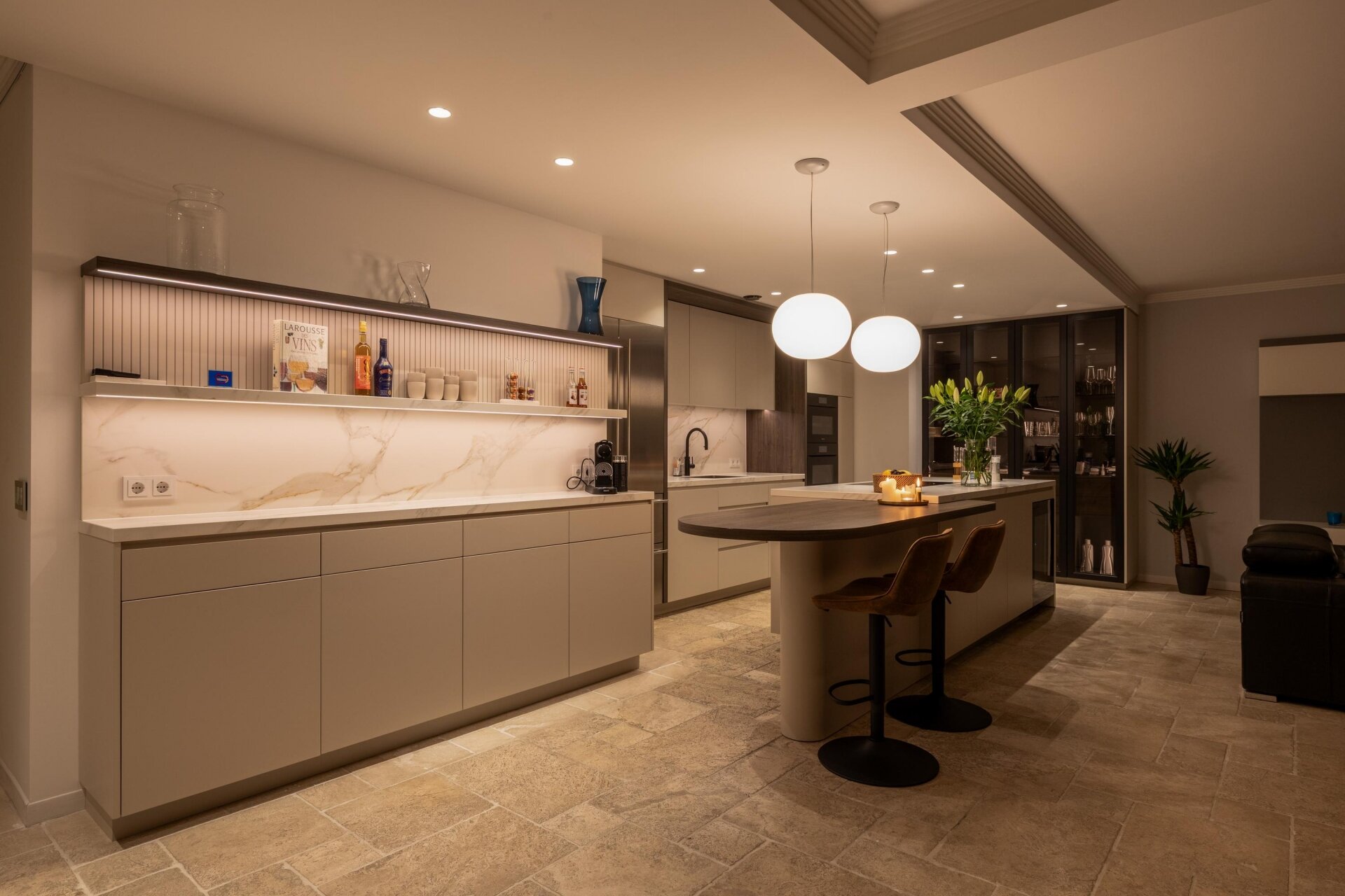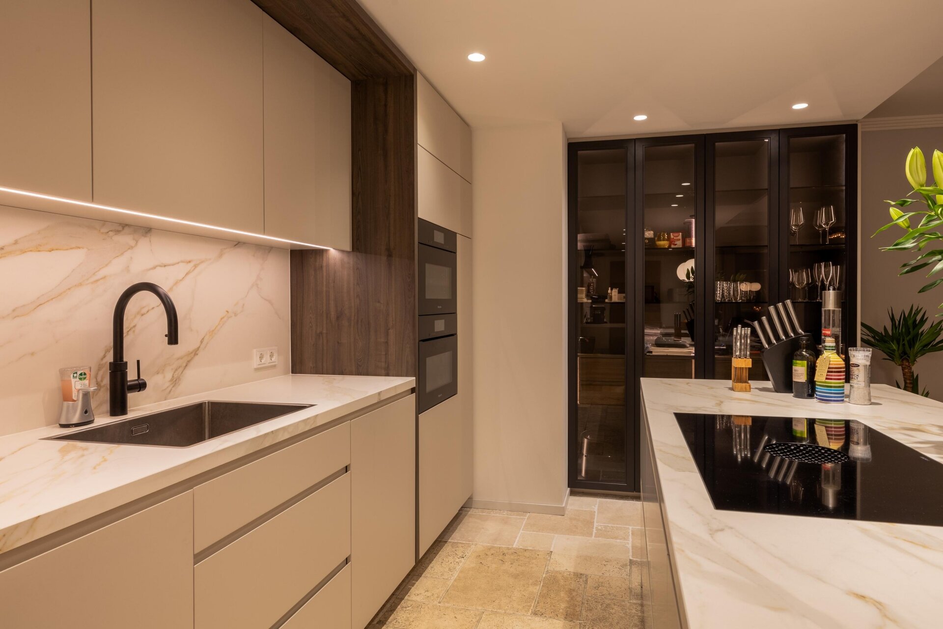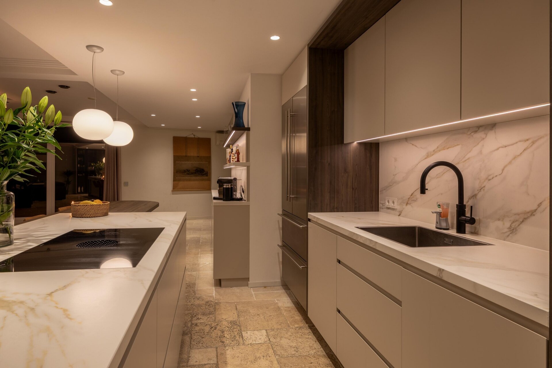 Centraal in de ruimte ligt de gloednieuwe keuken (2025): een echte blikvanger! Voorzien van een kookeiland, strakke marmerlook werkbladen, hoogwaardige inbouwapparatuur (Miele) en veel opbergruimte. Het eiland biedt bovendien plaats voor een gezellige zit aan de bar, waardoor koken en samenzijn vanzelf samengaan.