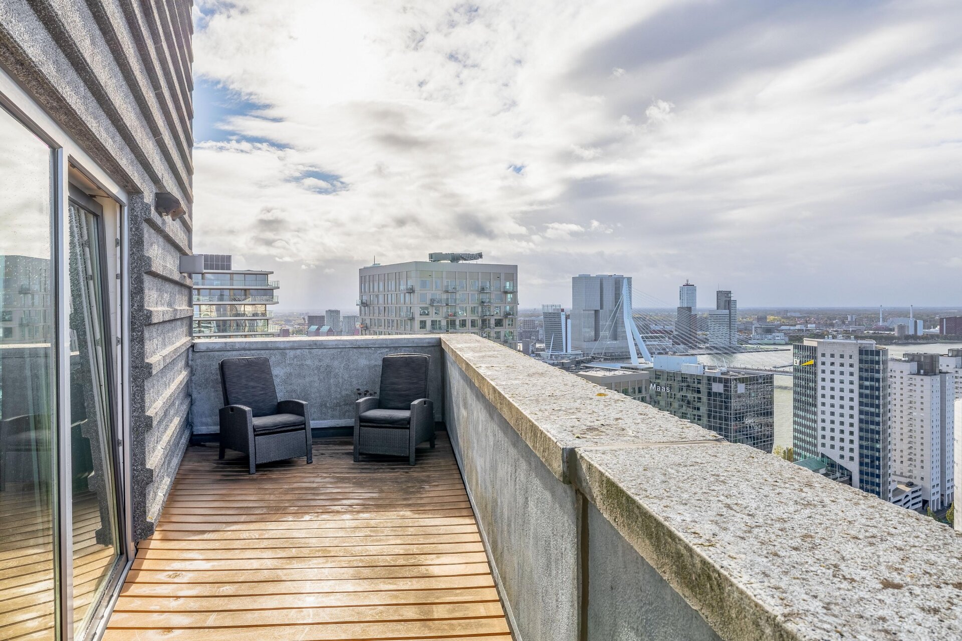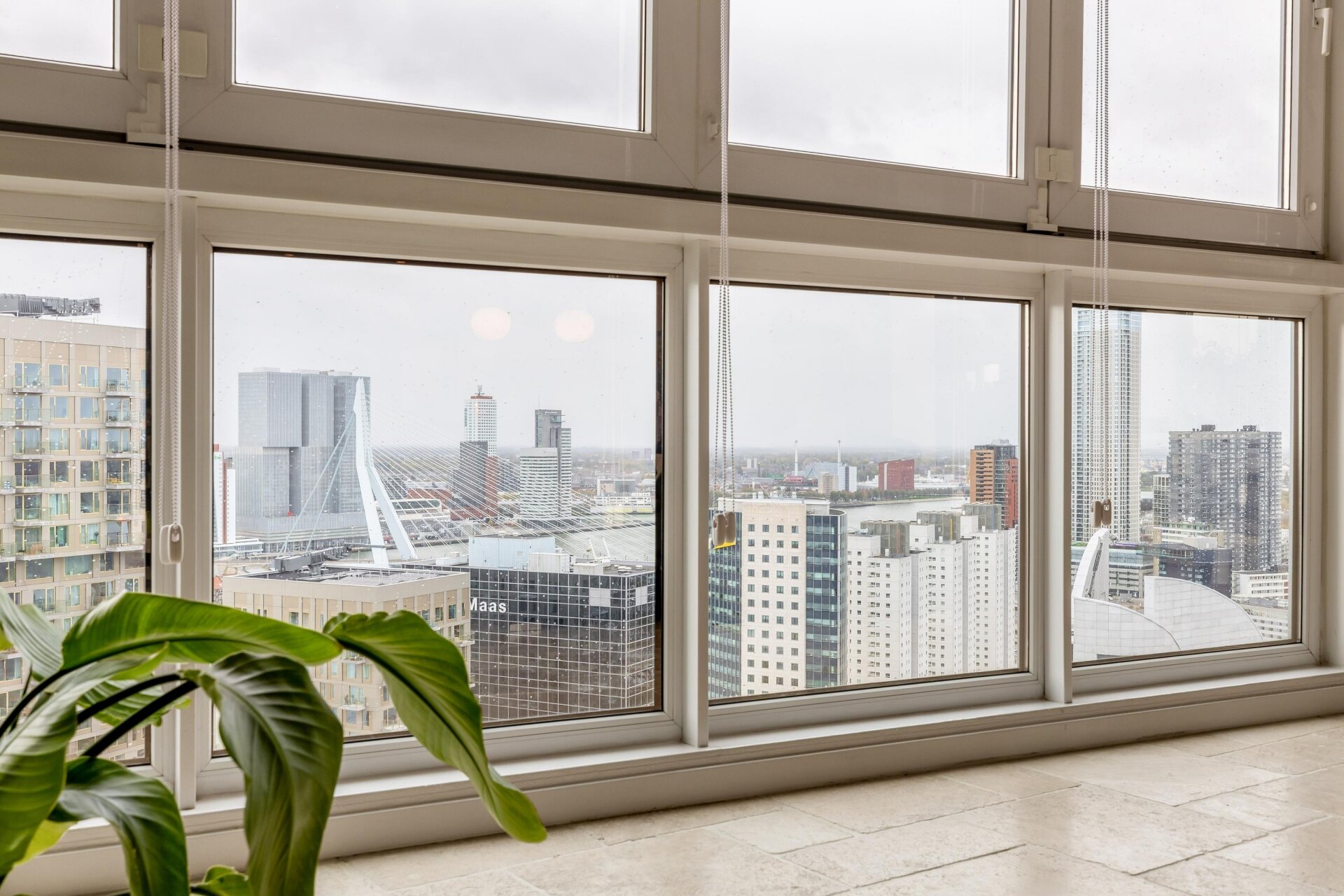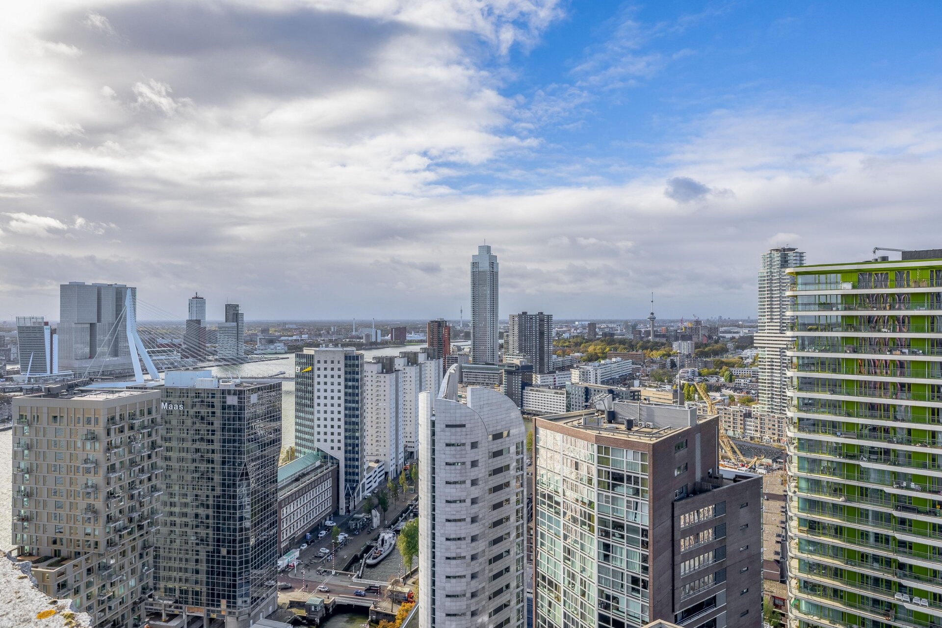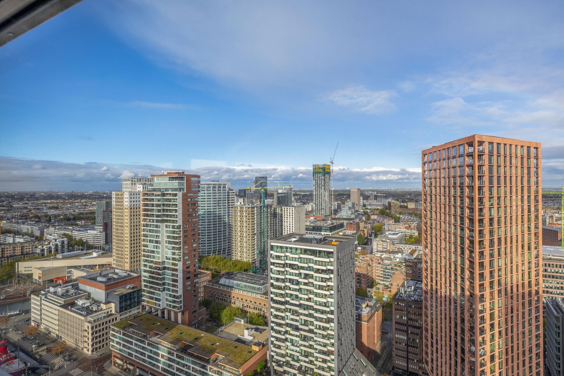 Binnenkomend via de centrale entree en lift kom je aan op de 34e verdieping. Daar opent zich een verrassend royale leefruimte, waar comfort en afwerking tot in detail samenkomen. Het panoramische uitzicht is werkelijk adembenemend; overdag kijk je uit over de stad en het water, 's avonds zorgen de duizenden lichtjes van Rotterdam voor een sfeer die nooit verveelt.