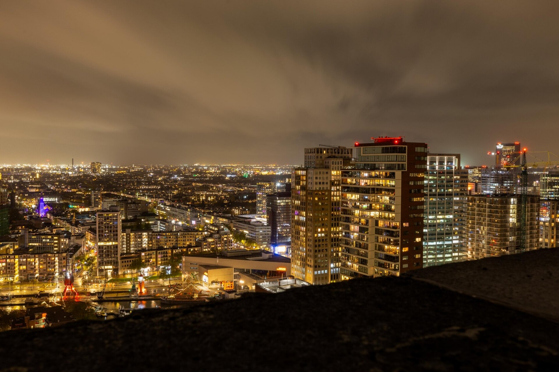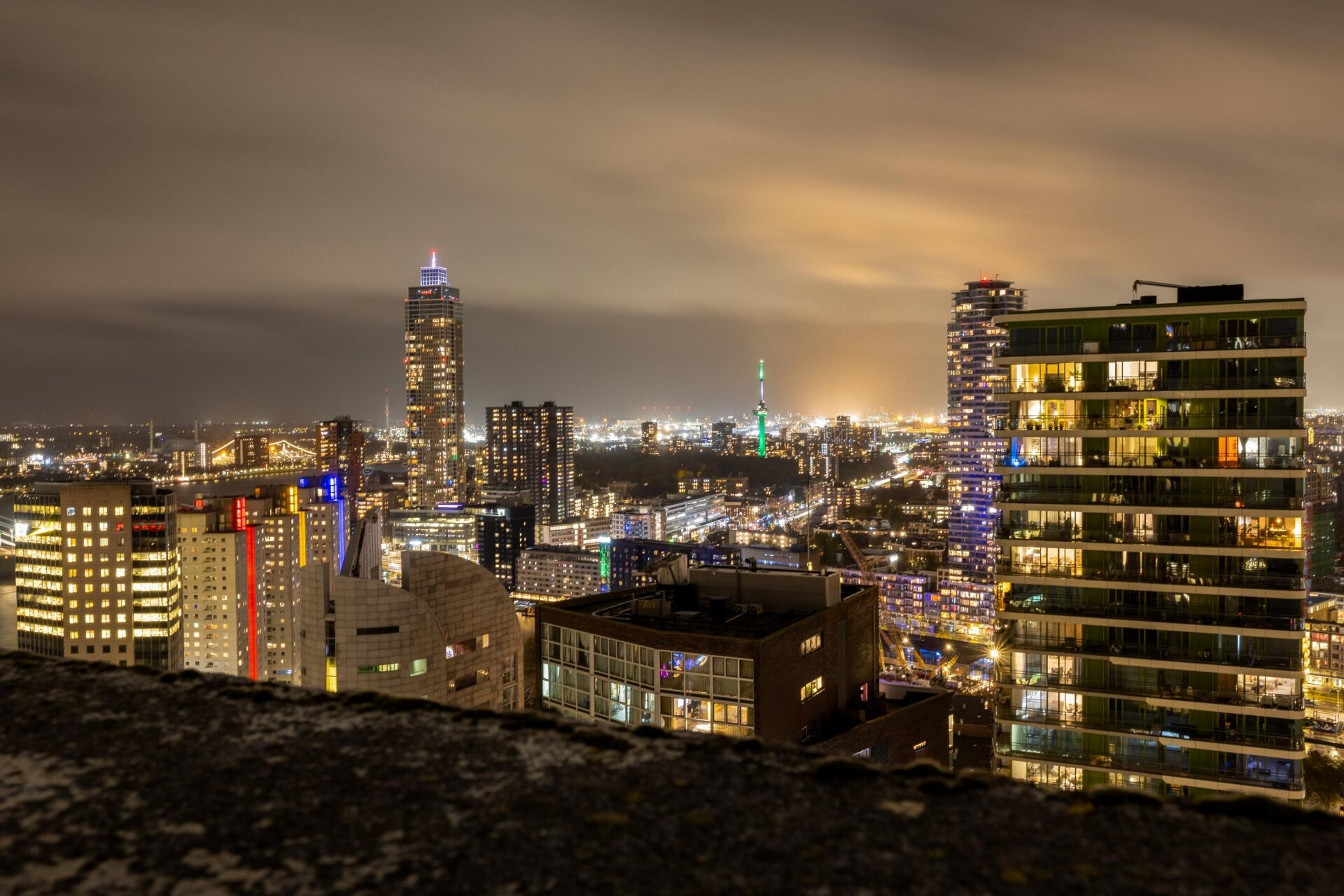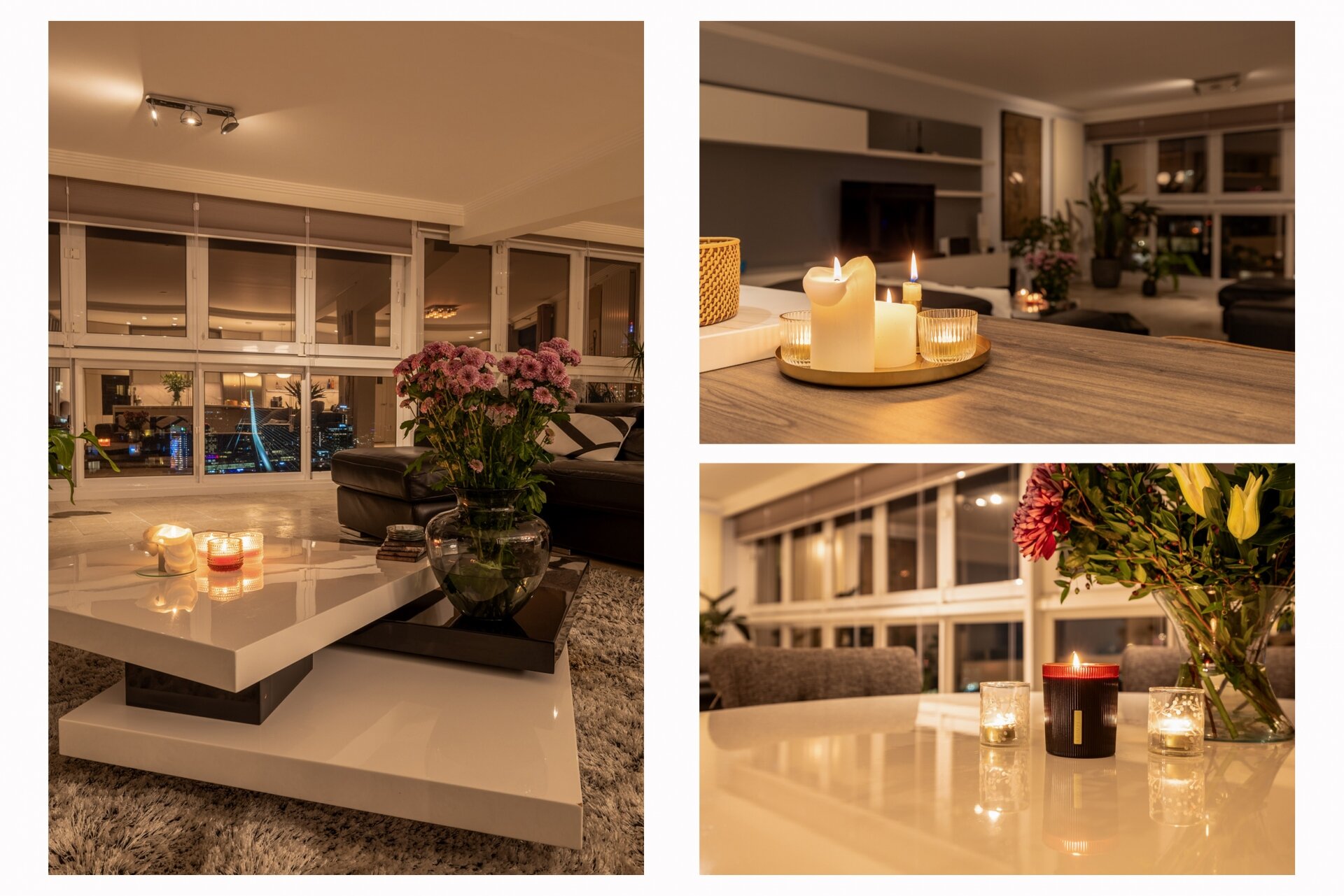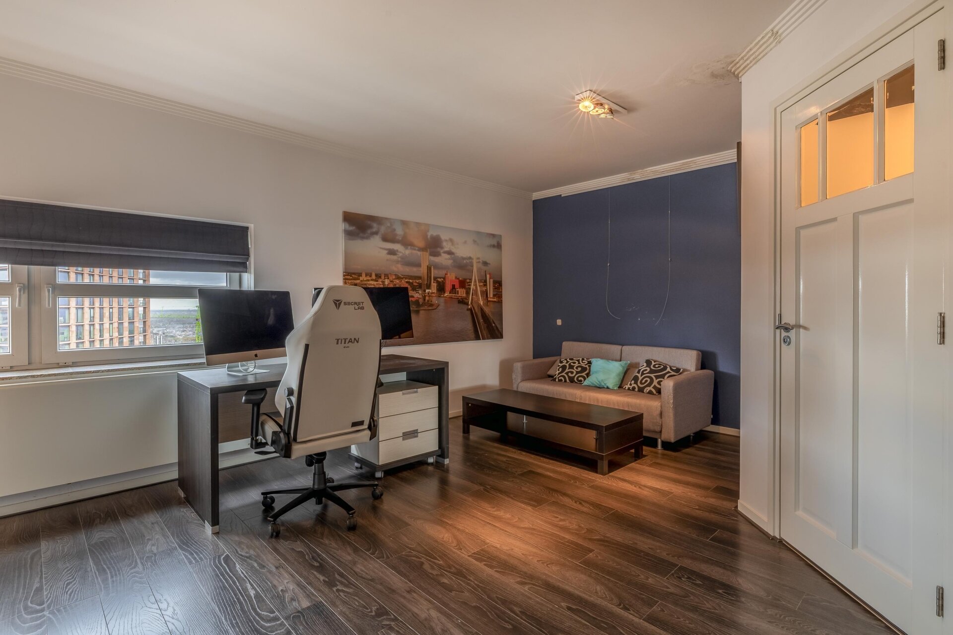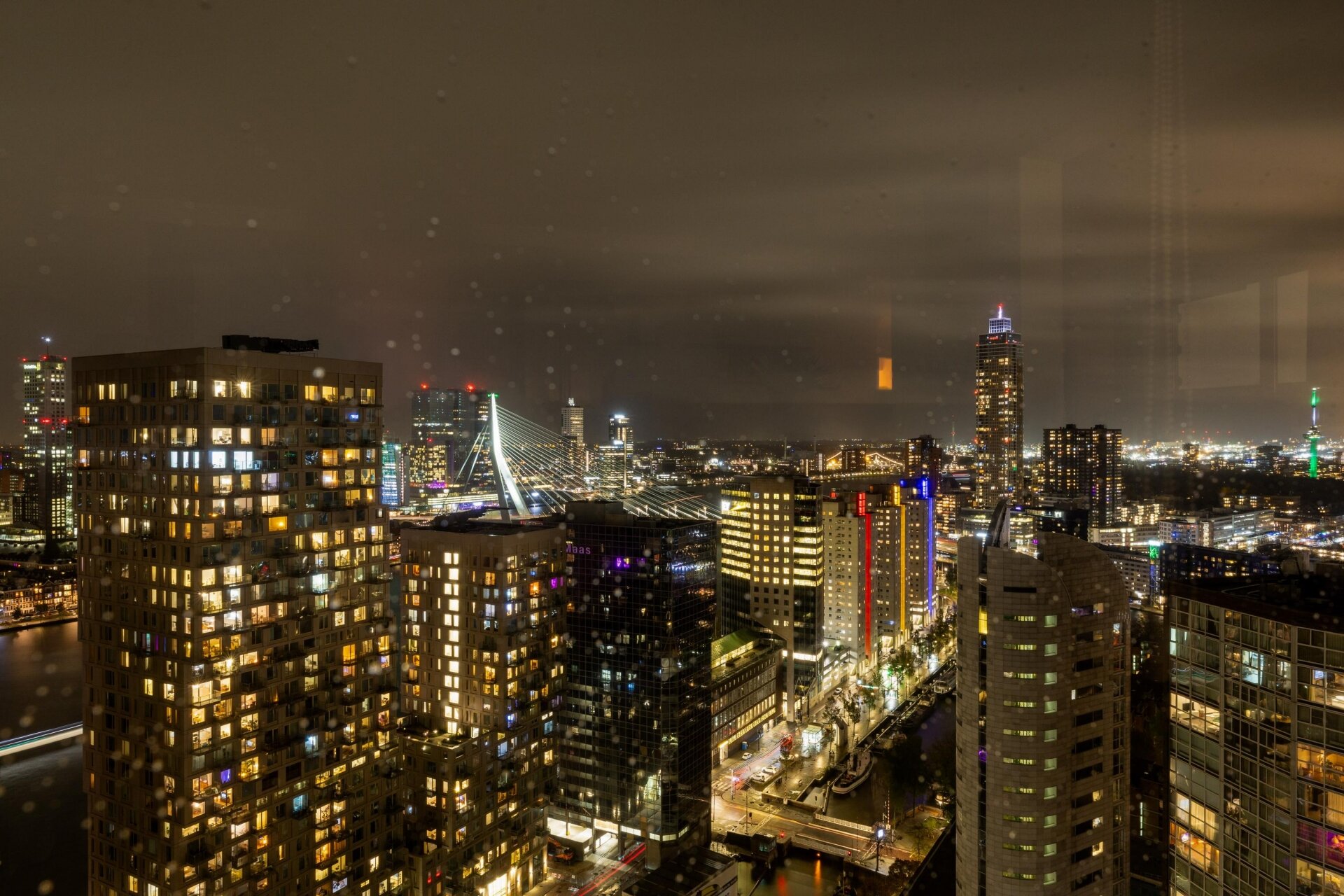 Binnenkomend via de centrale entree en lift kom je aan op de 34e verdieping. Daar opent zich een verrassend royale leefruimte, waar comfort en afwerking tot in detail samenkomen. Het panoramische uitzicht is werkelijk adembenemend; overdag kijk je uit over de stad en het water, 's avonds zorgen de duizenden lichtjes van Rotterdam voor een sfeer die nooit verveelt.