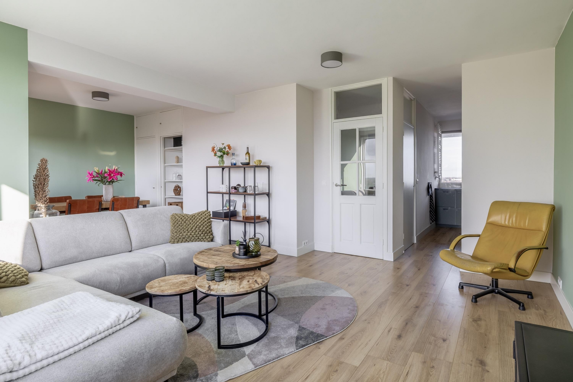 De woonkamer is zonder twijfel het hart van dit appartement. Dankzij de grote ramen en de noordwestelijke ligging geniet je hier tot laat van het daglicht en in de avond van sfeervolle zonsondergangen boven de stad. Het uitzicht over het groen van Schiebroek en waterpartijen maakt dit een plek waar je elke dag opnieuw van geniet. De ruimte is strak afgewerkt met een moderne vloer en rustige kleuren.