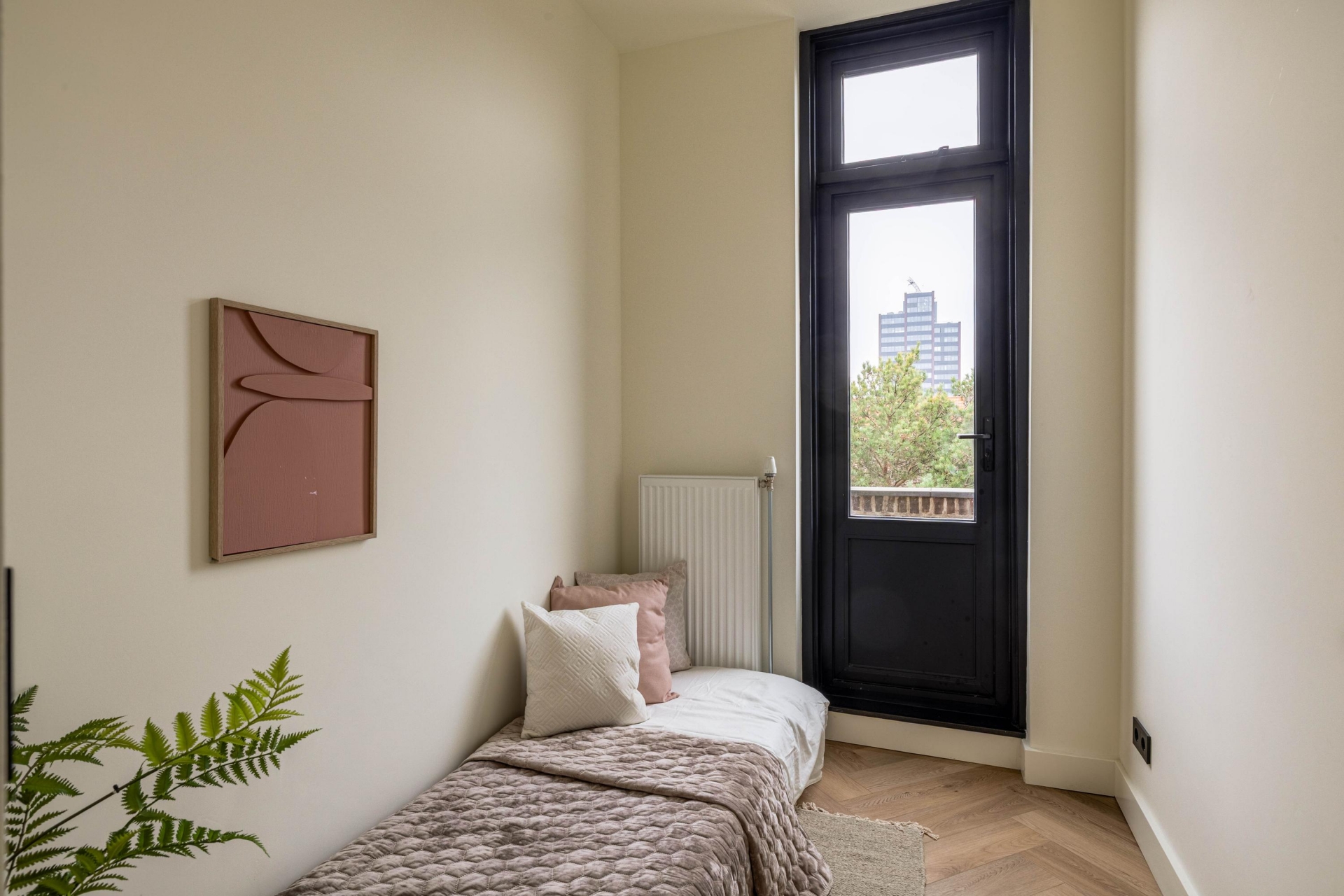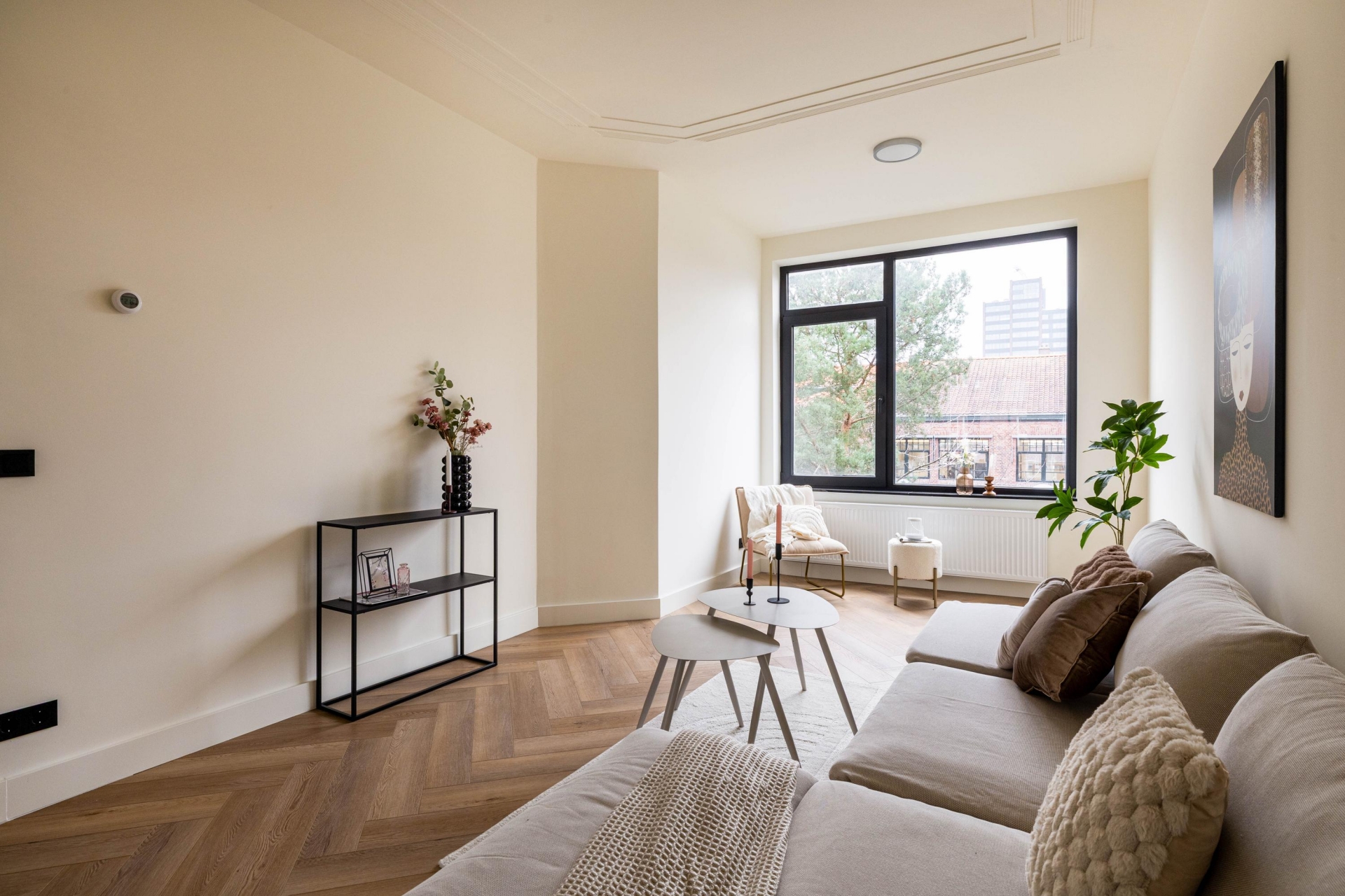 Vanaf het eerste moment voelt dit appartement solide en doordacht. De hoge plafonds, royale raampartijen en strakke afwerking zorgen voor rust en ruimte. Door het hele appartement ligt een pvc visgraatvloer die warmte, luxe en eenheid brengt. Elk detail is zorgvuldig gekozen, met als resultaat een woning die niet alleen mooi oogt, maar ook logisch en prettig aanvoelt.