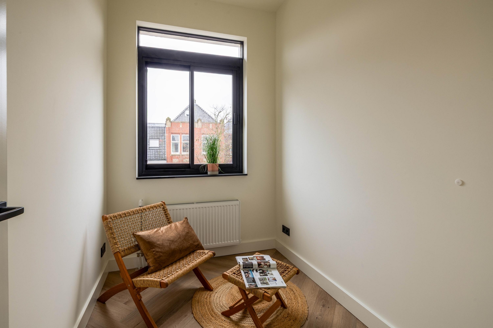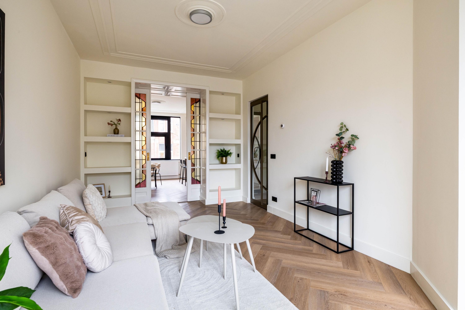De leefverdieping is royaal opgezet en baadt in het daglicht. Grote ramen zorgen voor een prettige lichtinval en de indeling biedt volop ruimte voor zowel een comfortabele zithoek als een ruime eethoek. De combinatie van de visgraatvloer, strakke wanden en subtiele details creëert een moderne, rustige sfeer met behoud van karakter.