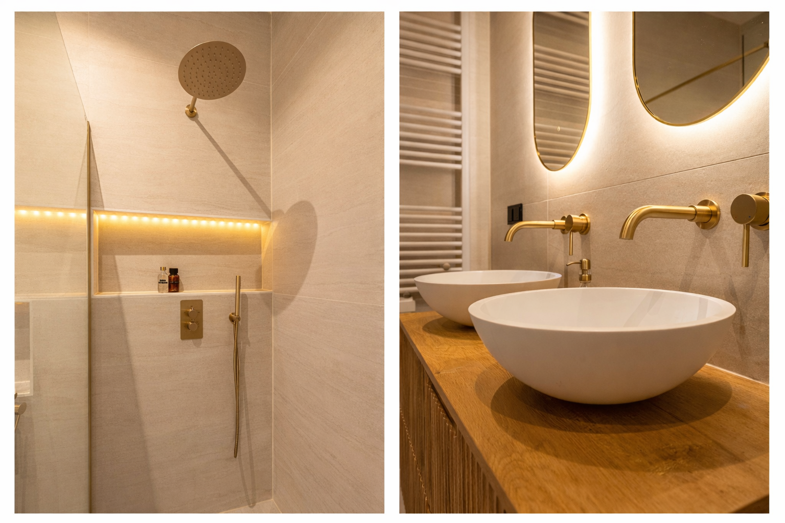 De badkamer is modern, stijlvol en tot in detail afgewerkt. Een plek om echt tot rust te komen. Voorzien van een ligbad, een ruime inloopdouche met strak glaswerk en een dubbele wastafel met elegante kranen. De gebruikte materialen zijn warm en tijdloos, wat zorgt voor een serene en verzorgde uitstraling. Daarnaast is er een separaat toilet in dezelfde hoogwaardige stijl.