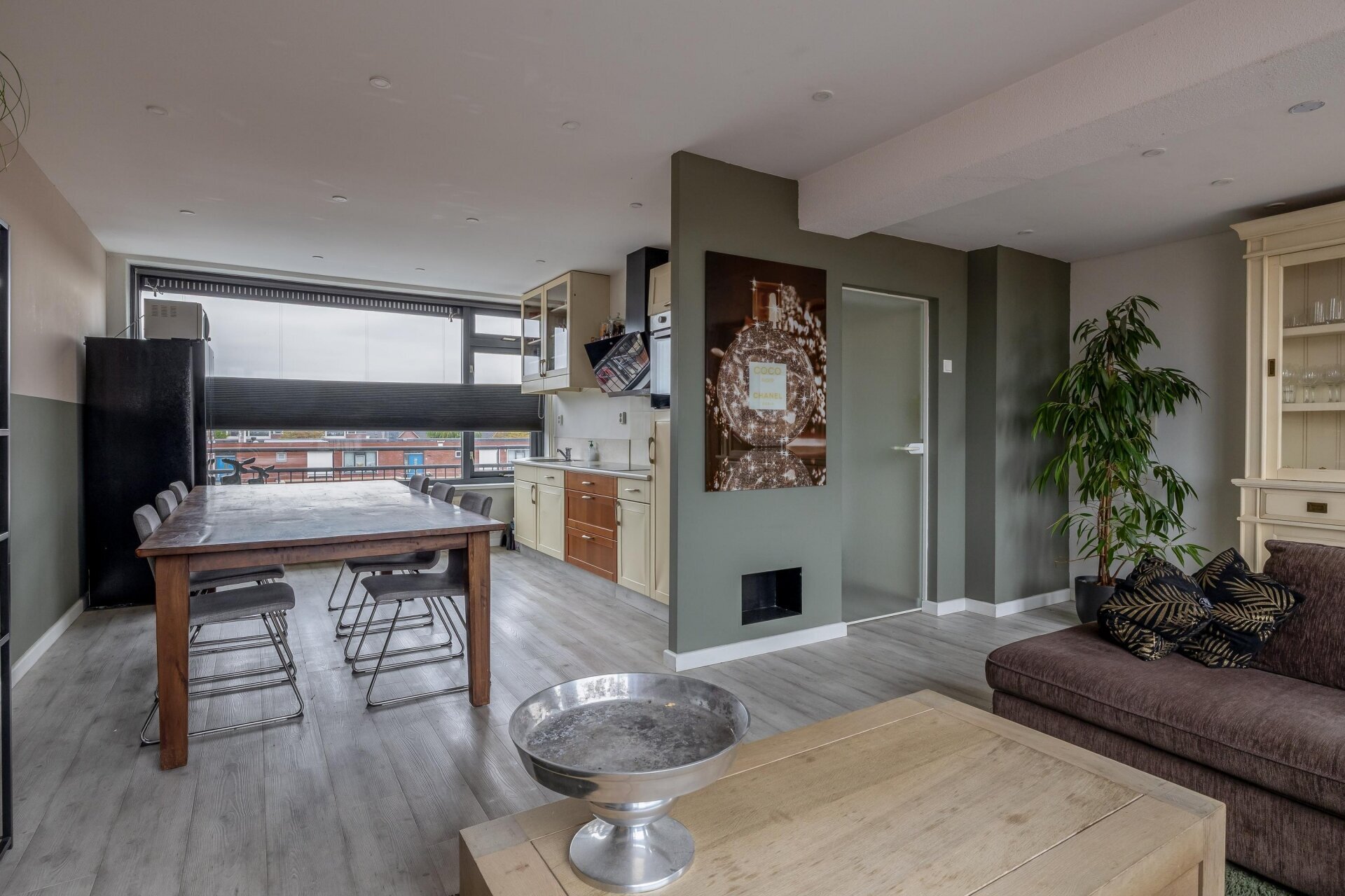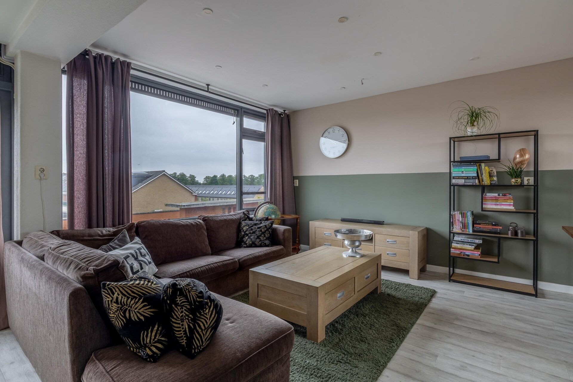 De lichte woonkamer is voorzien van houten kozijnen met dubbele beglazing en biedt toegang tot het balkon met uitzicht op De Schoof.