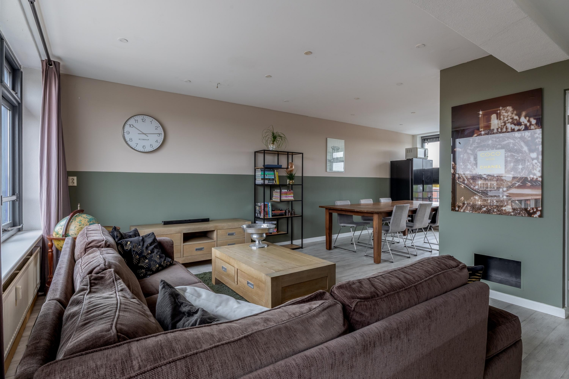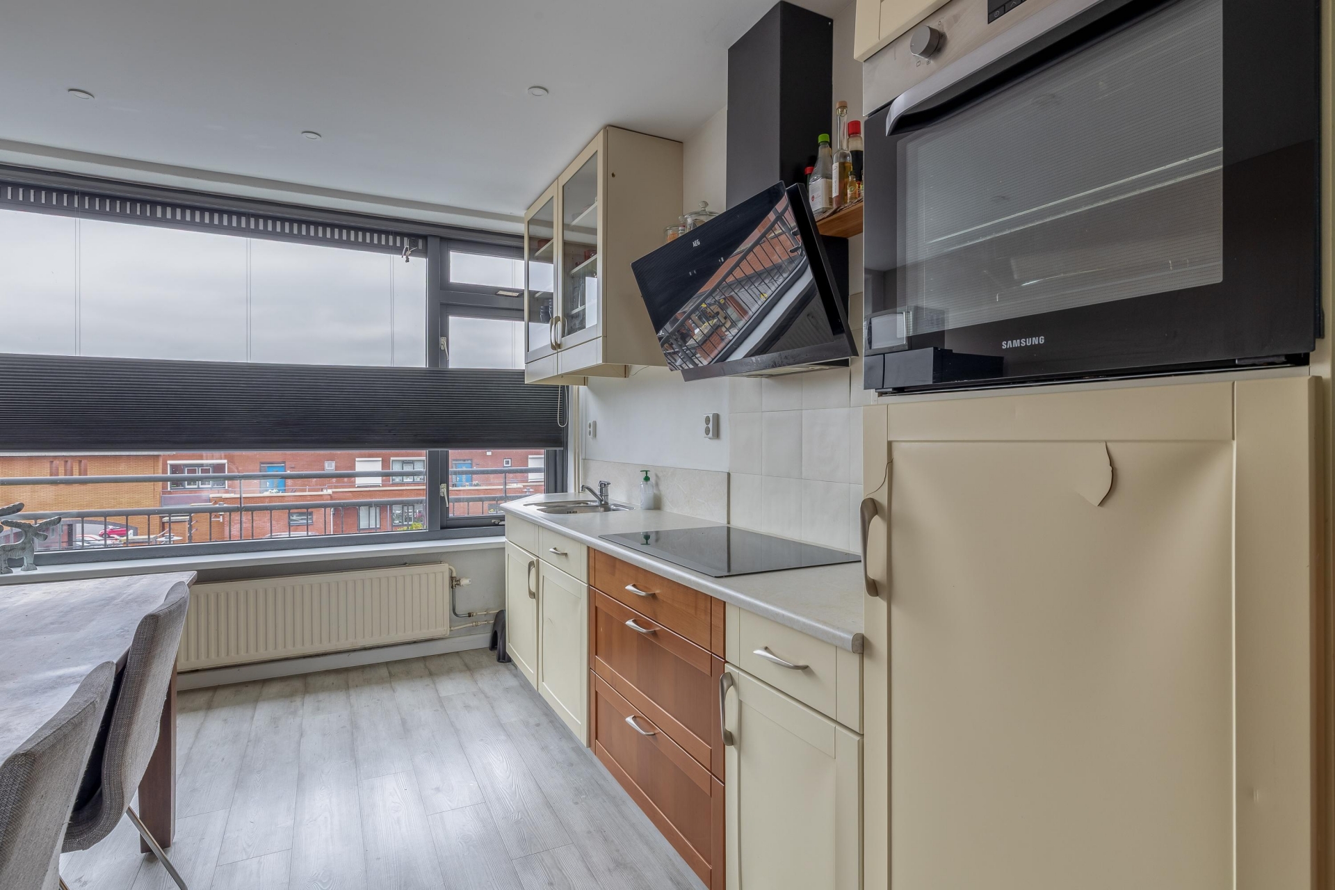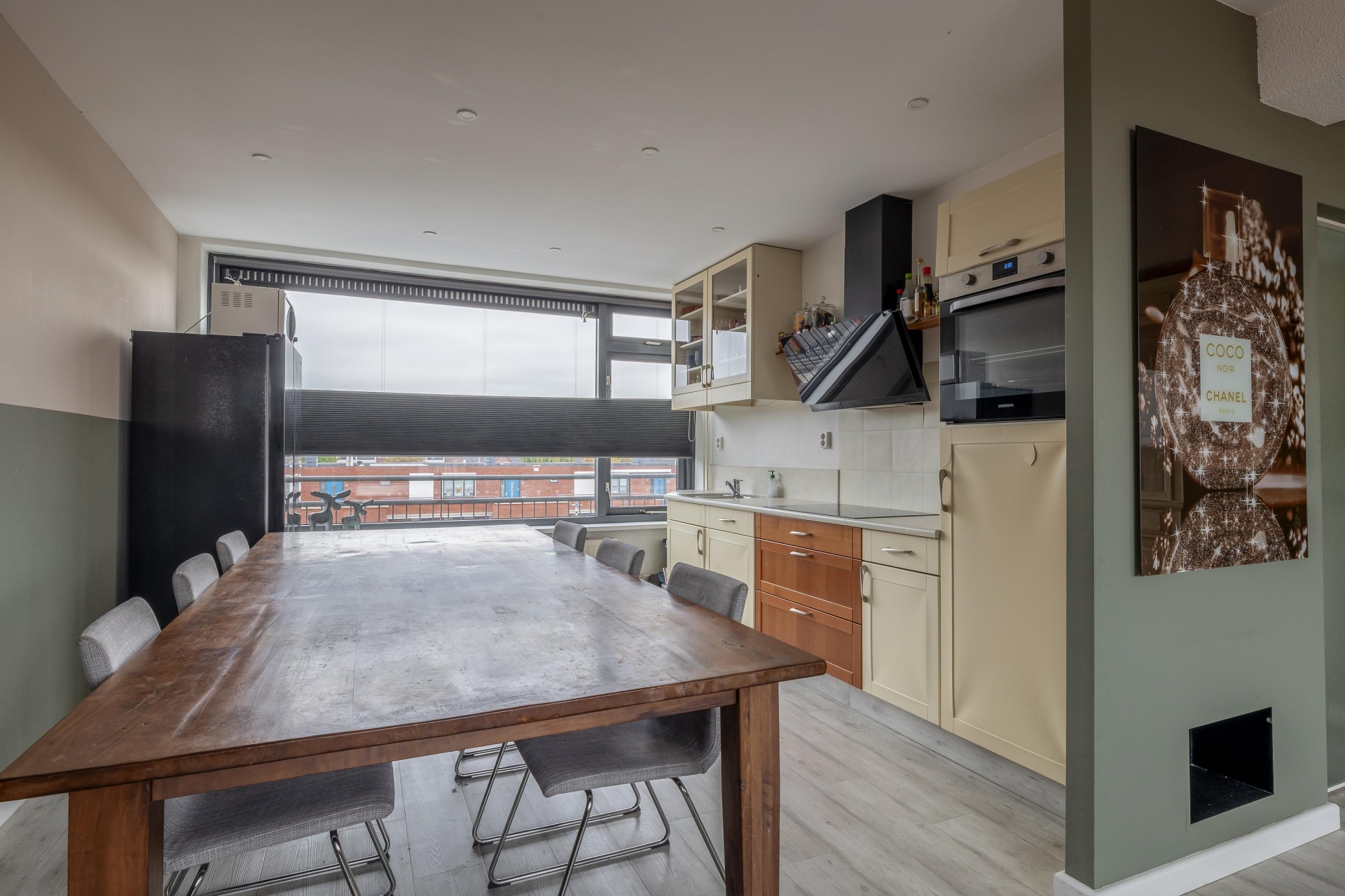 De ruime woonkamer vormt het hart van de woning. Grote raampartijen met houten kozijnen en dubbele beglazing zorgen voor een stijlvolle uitstraling en creëren een doorlopende lichtinval. Vanuit de woonkamer stapt u direct het balkon op, waar u in alle rust kunt genieten van het vrije uitzicht over de levendige omgeving.