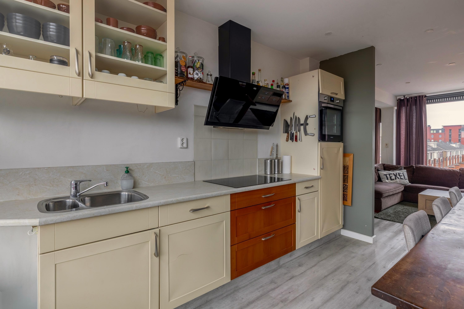 De verzorgde keuken straalt eenvoud en functionaliteit uit, uitgerust met o.a. een afzuigkap, koelkast en oven. Voor wie graag kookt vormt dit een heerlijke basis en voor wie droomt van een moderne leefkeuken biedt deze ruimte volop potentie voor maatwerk.