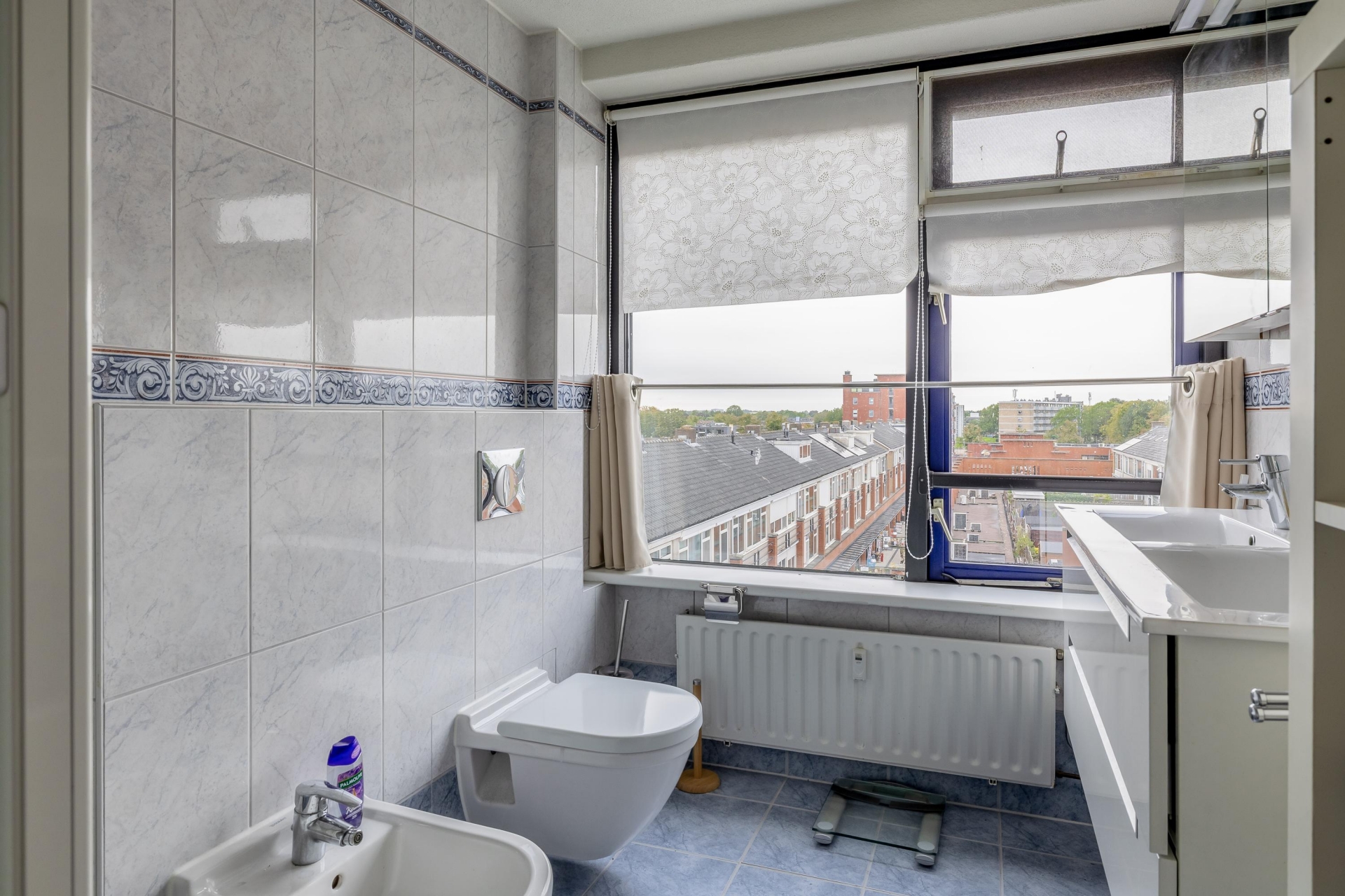 De volledig betegelde badkamer is voorzien van een ruime wastafel, douche en toilet—een frisse, verzorgde ruimte waar functionaliteit en comfort samenkomen. Daarnaast beschikt het appartement over een luxe extra: een separaat tweede toilet met wastafel.