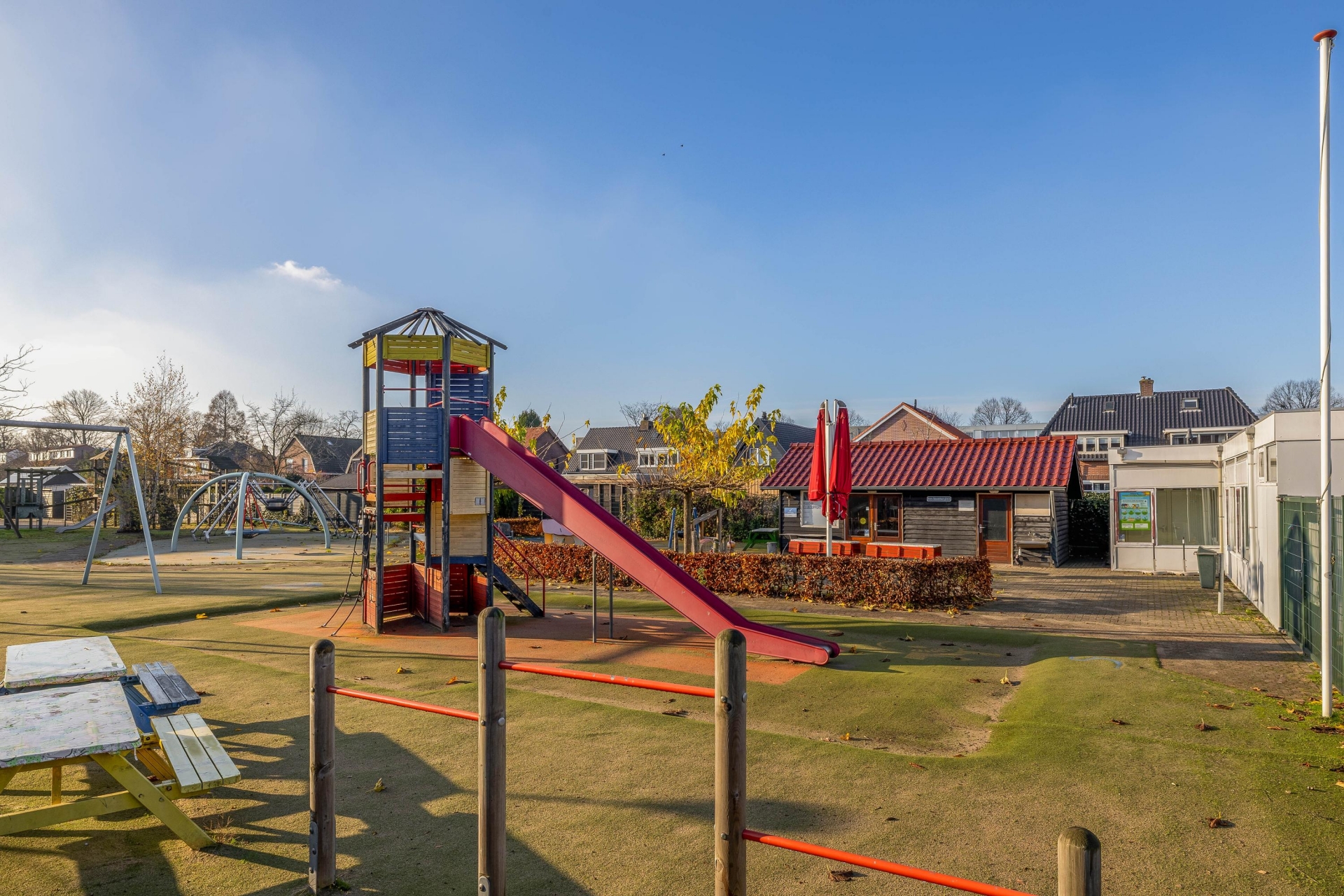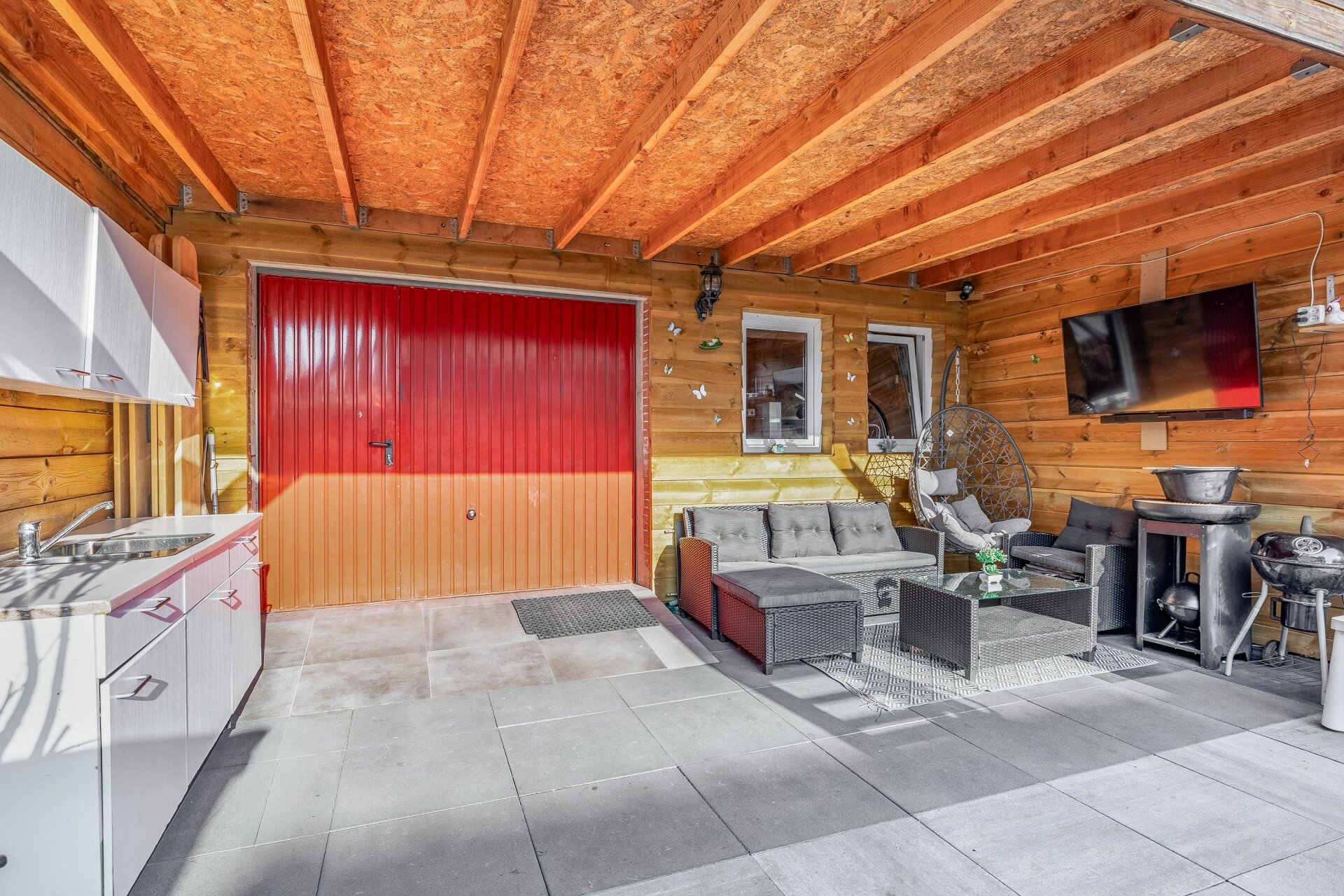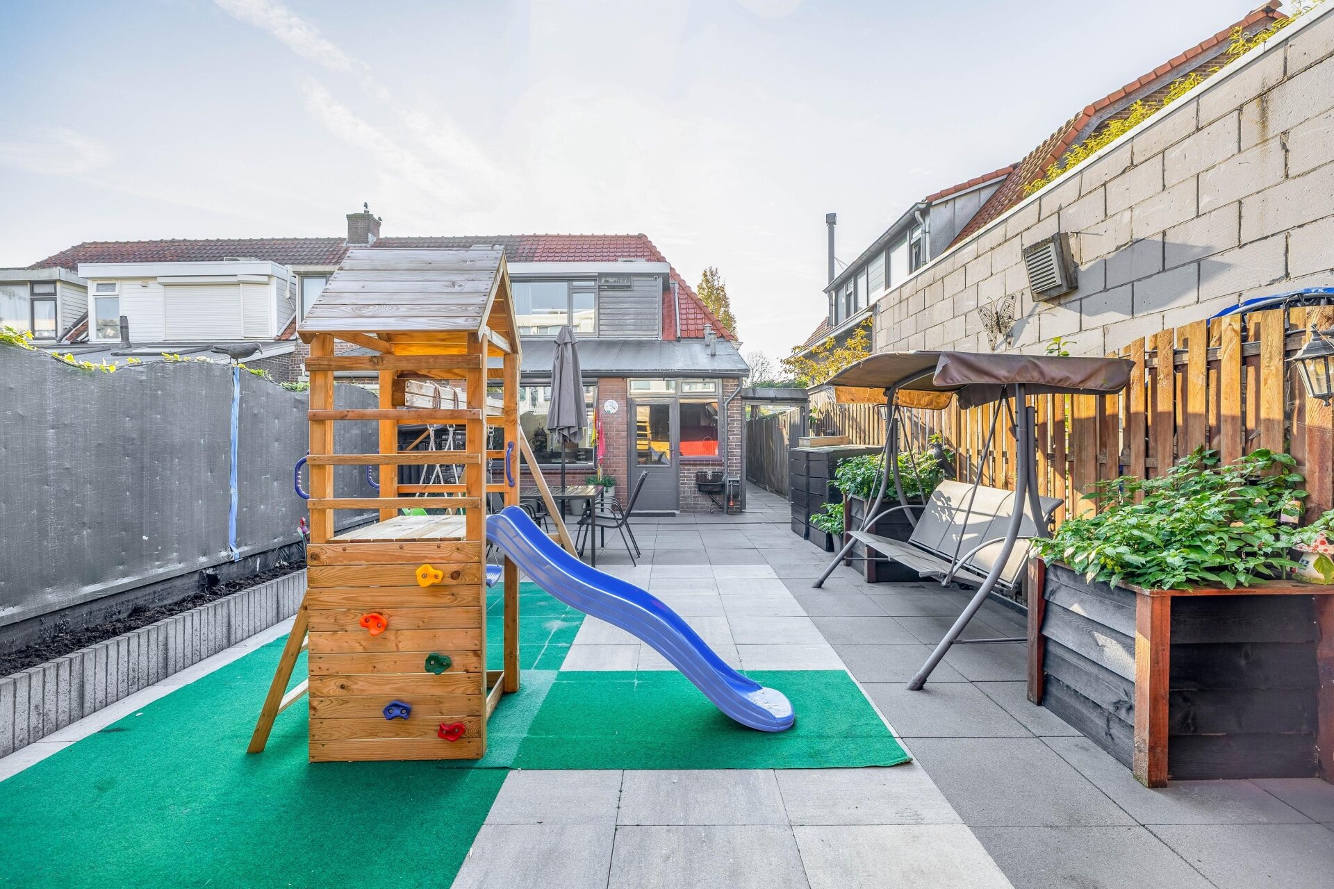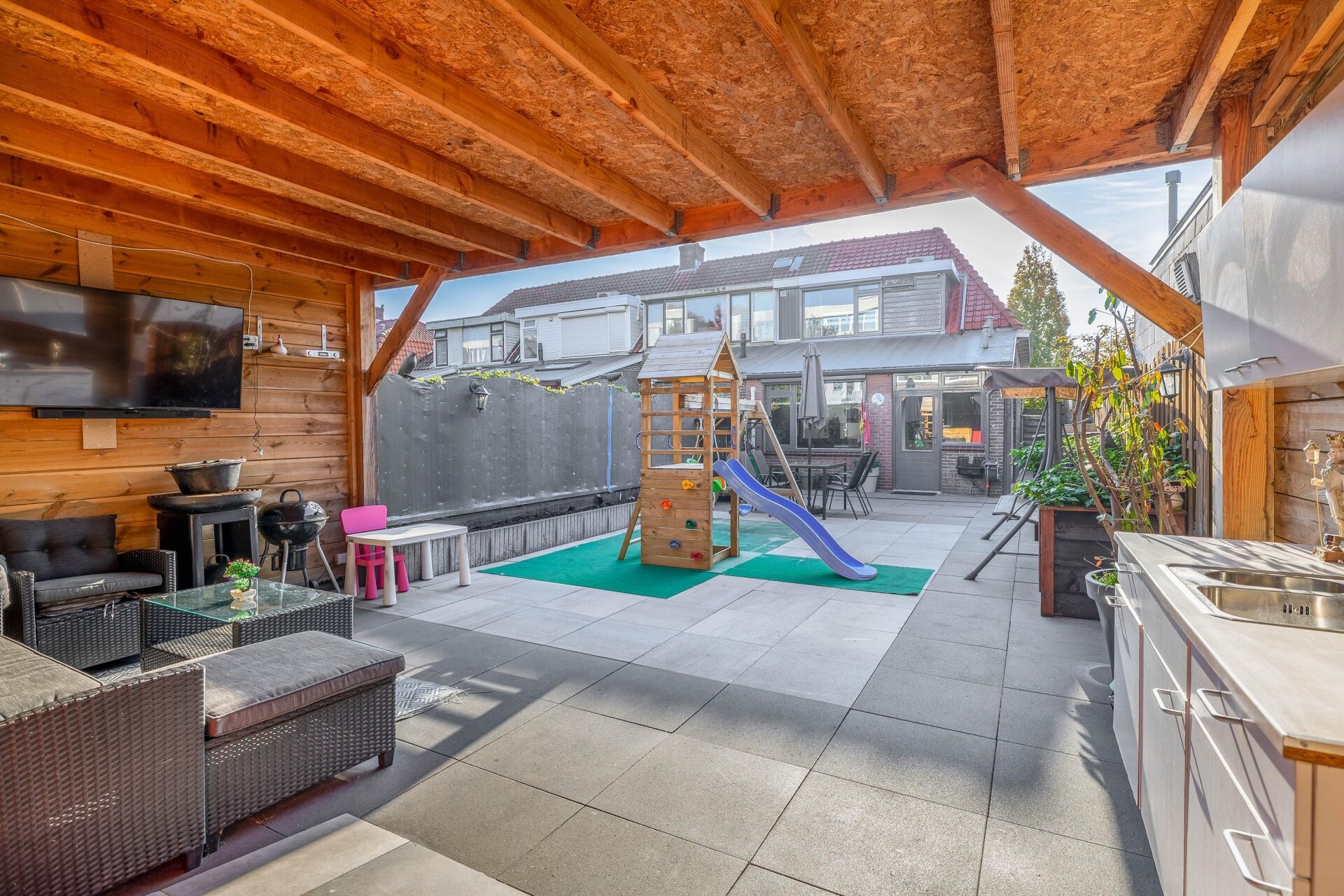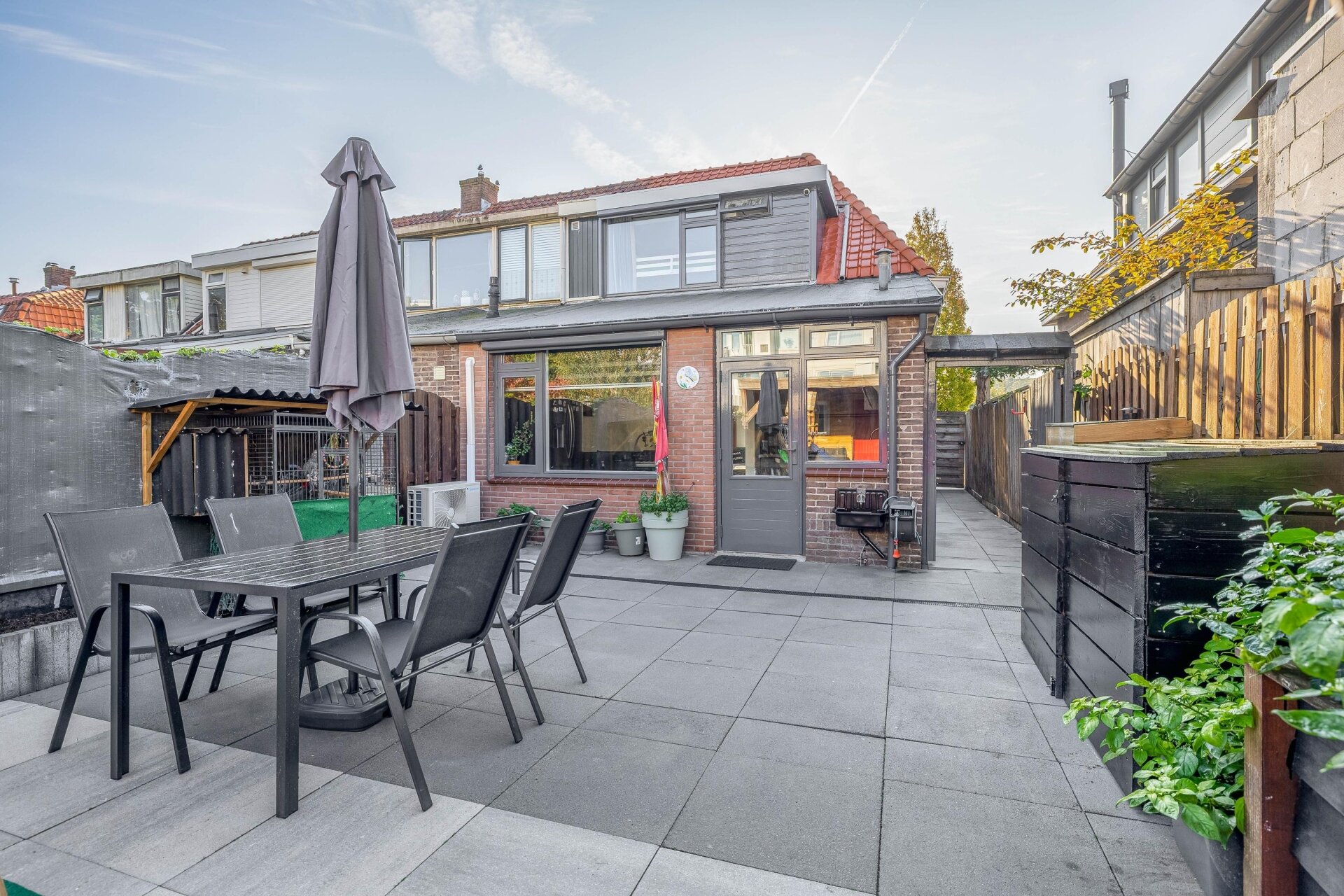 Vanuit de woonkamer loop je zo de onderhoudsarme achtertuin in. Achter in de tuin vind je een gezellige overkapping en daarachter een zeer riante berging 46 m2 – ideaal voor fietsen, hobby’s of extra opslagruimte.