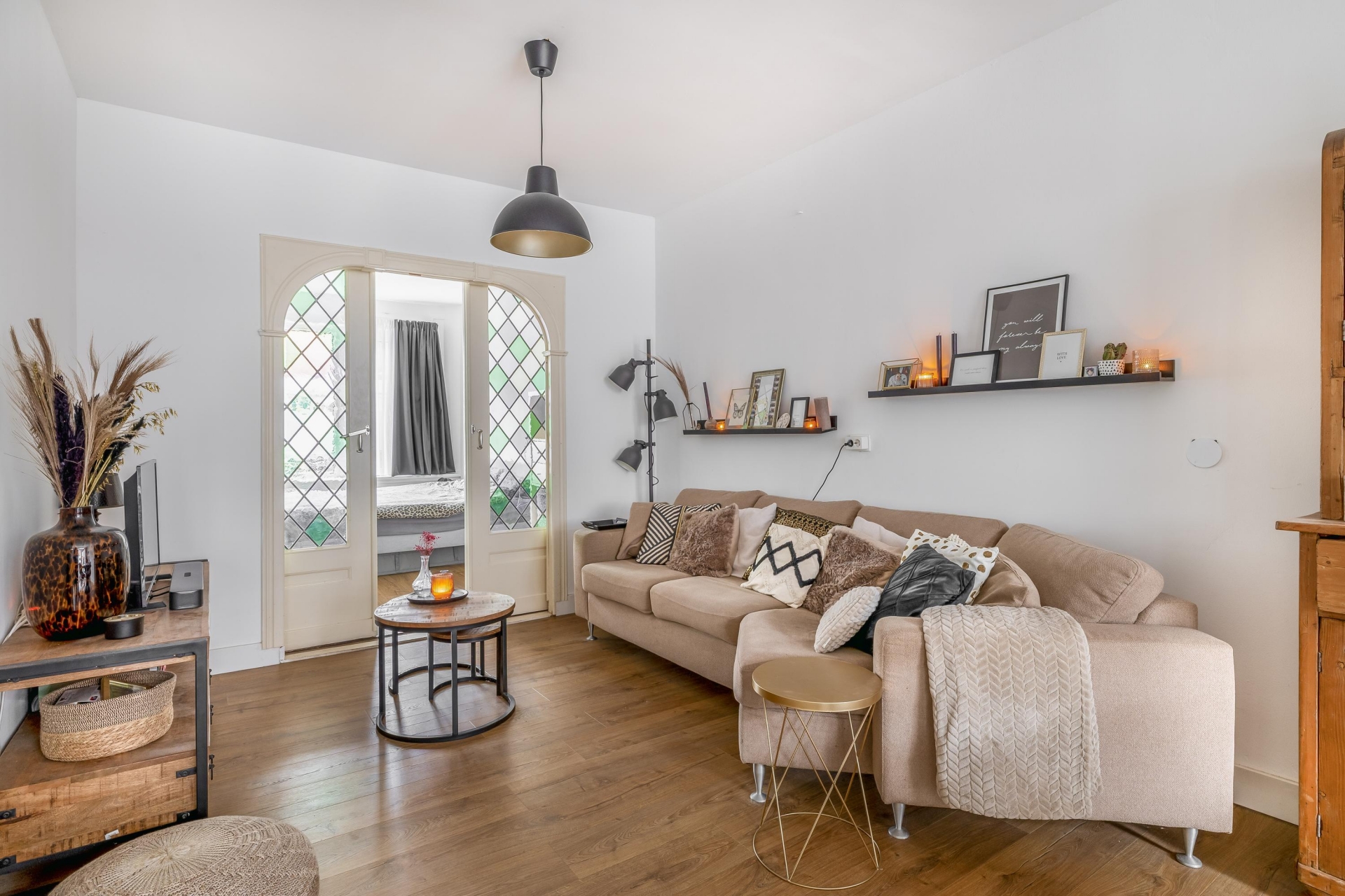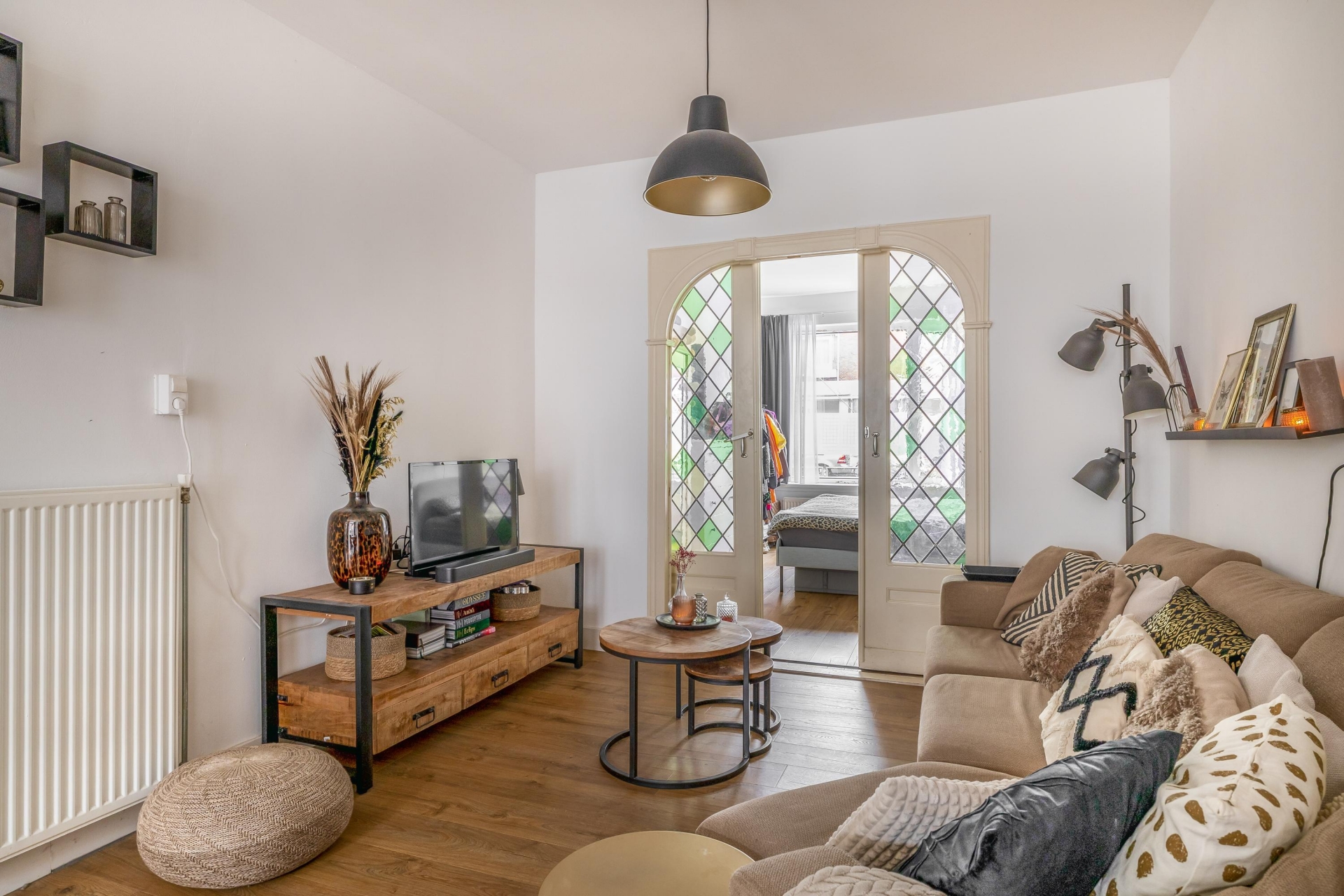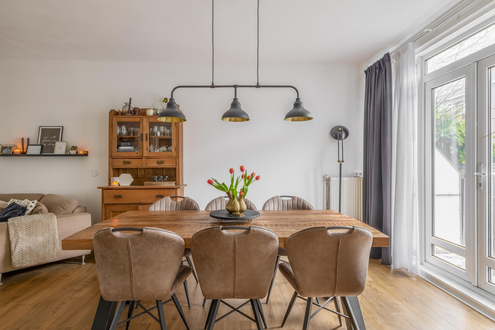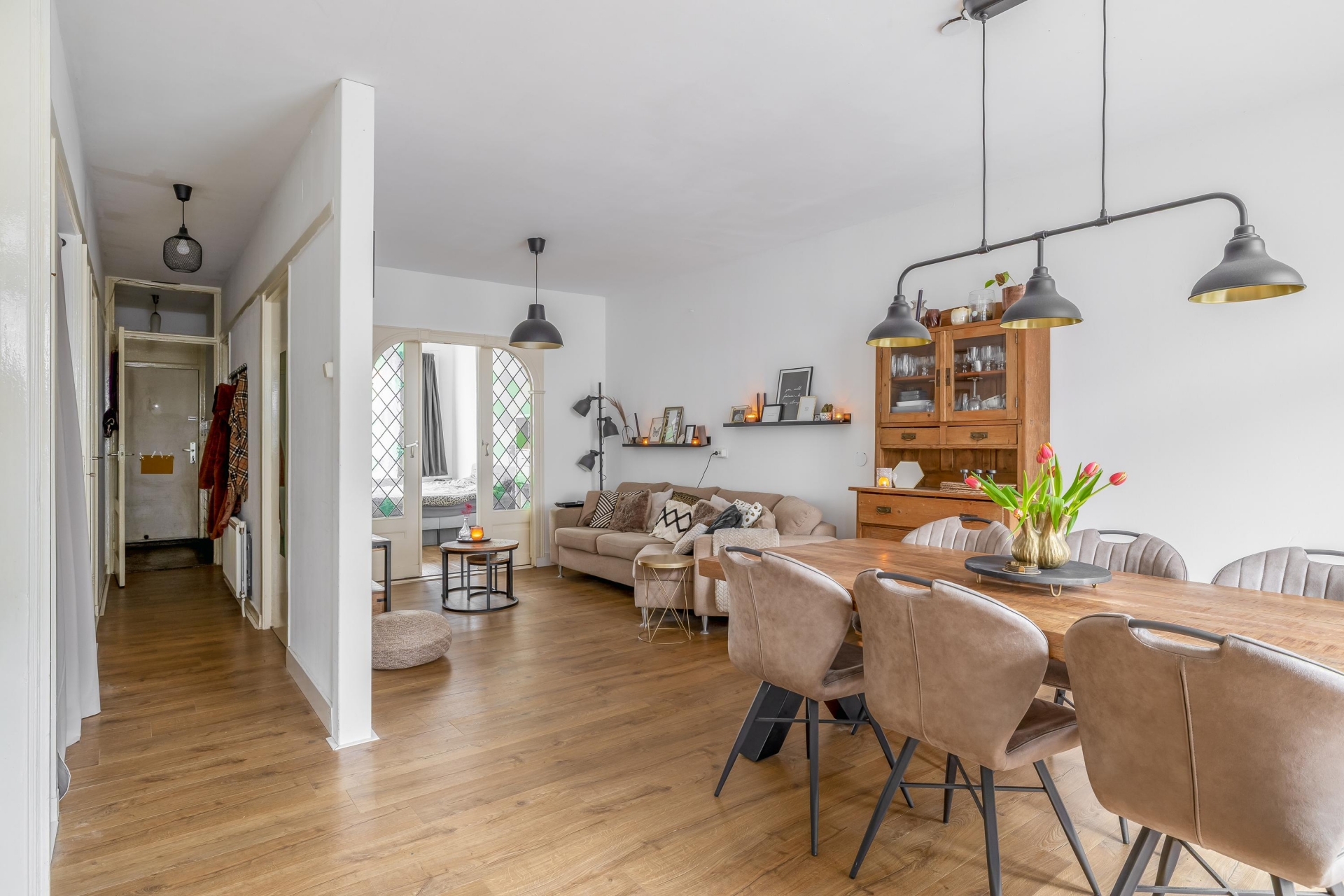 De woonkamer is direct een fijne plek om thuis te komen. Dankzij de grote raampartijen en de lichte afwerking voelt de ruimte open en prettig aan. De glas-in-lood en suitedeuren tussen de woonkamer en de slaapkamer zorgen voor karakter én een mooie lichtinval. De wanden zijn in 2021 nog geschilderd en de doorgelegde laminaatvloer draagt bij aan een warme, rustige basis die bij veel interieurstijlen past. Een comfortabele zithoek, ruimte voor een eettafel en een mooi zicht op de tuin maken het plaatje compleet.