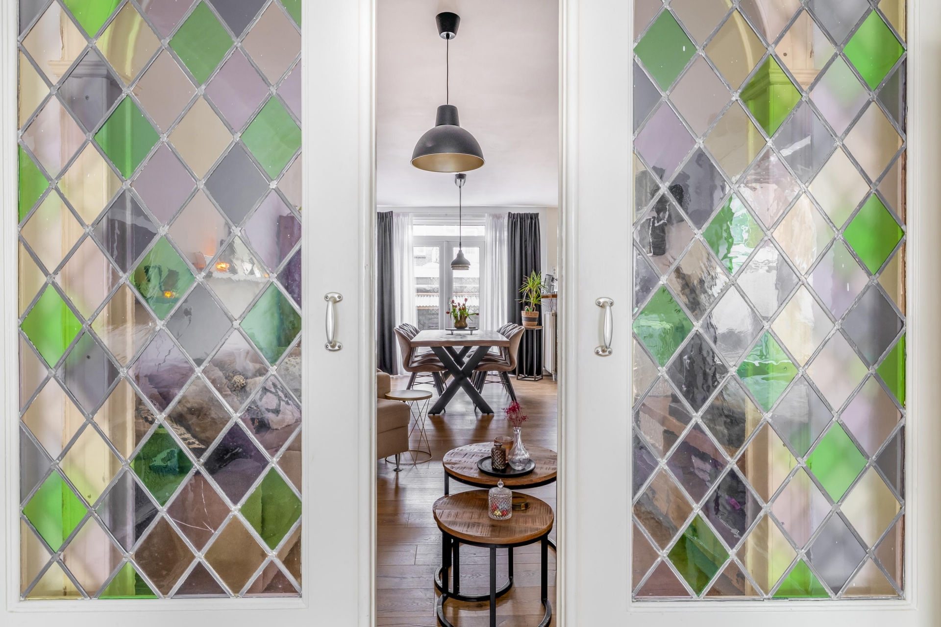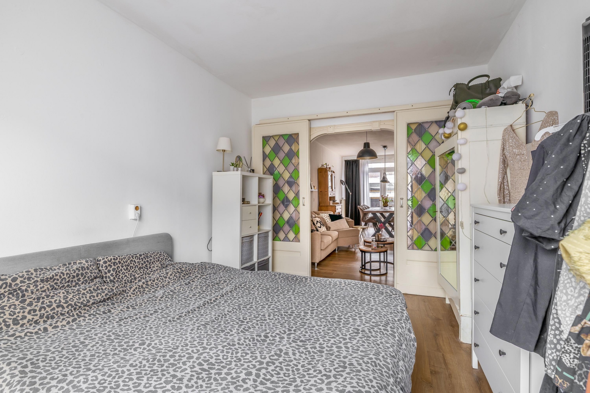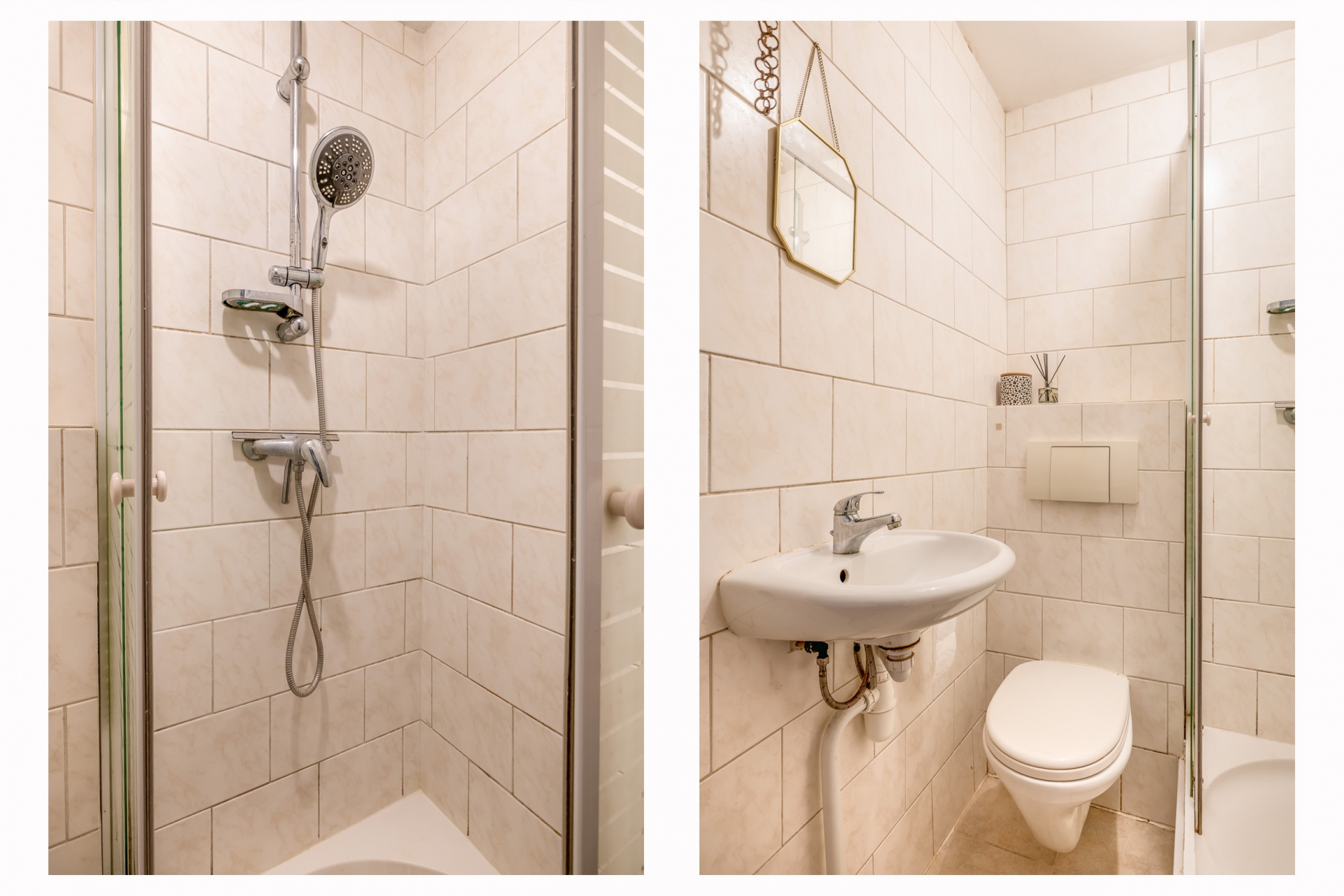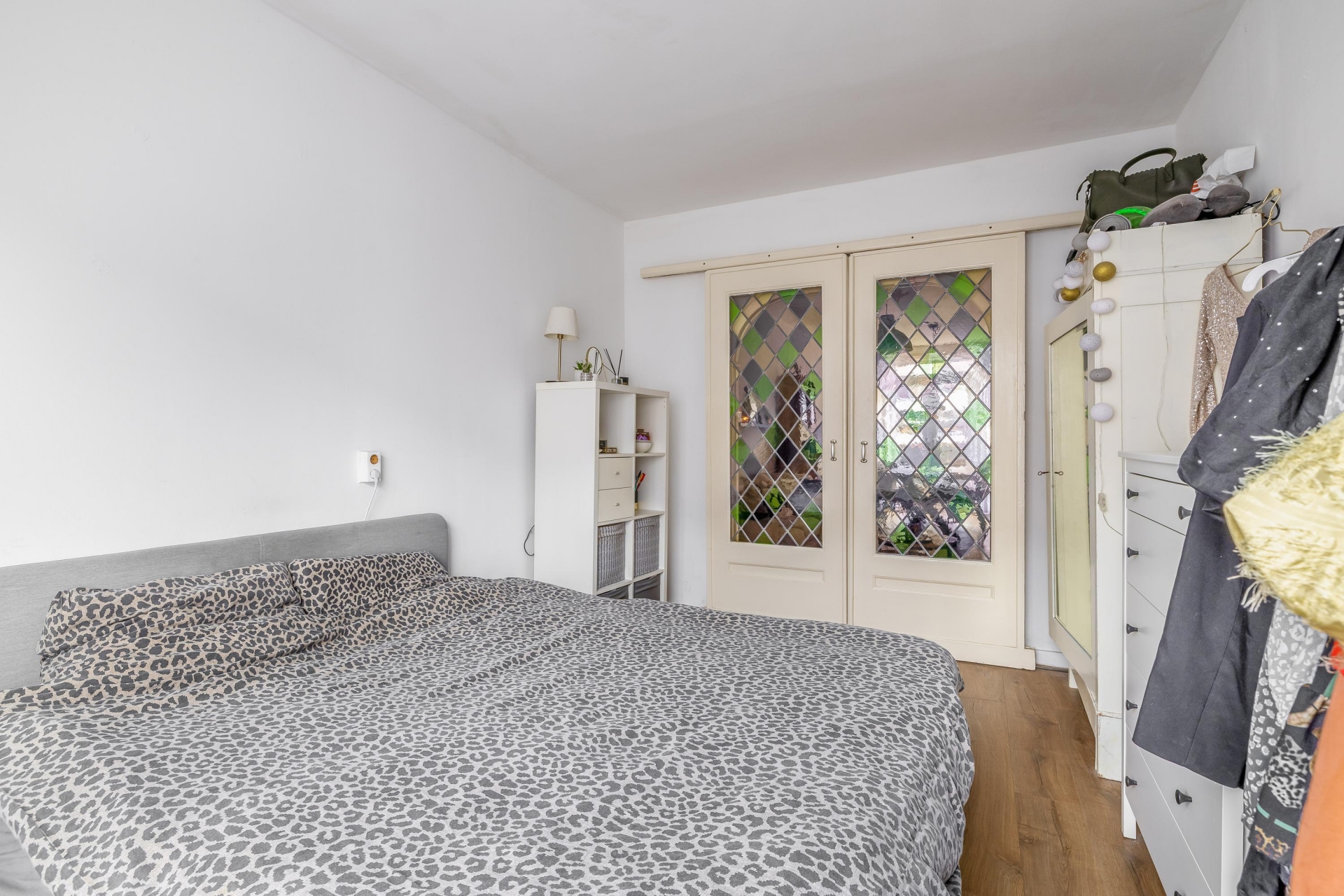 De slaapkamer ligt aan de voorzijde en biedt voldoende plek voor een tweepersoonsbed en een kledingkast. Dankzij de karaktervolle glas-in-lood deuren die doorlopen vanuit de woonkamer, blijft ook deze ruimte licht en sfeervol. De badkamer is compact maar functioneel, met een douche, wastafel en toilet. De badkamer is praktisch van opzet en netjes onderhouden. Hier heb je als koper de mogelijkheid jouw eigen stempel te drukken op de woning, maar valt ook in de huidige staat direct te gebruiken.