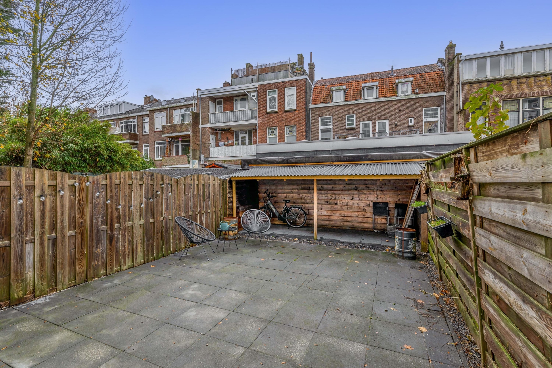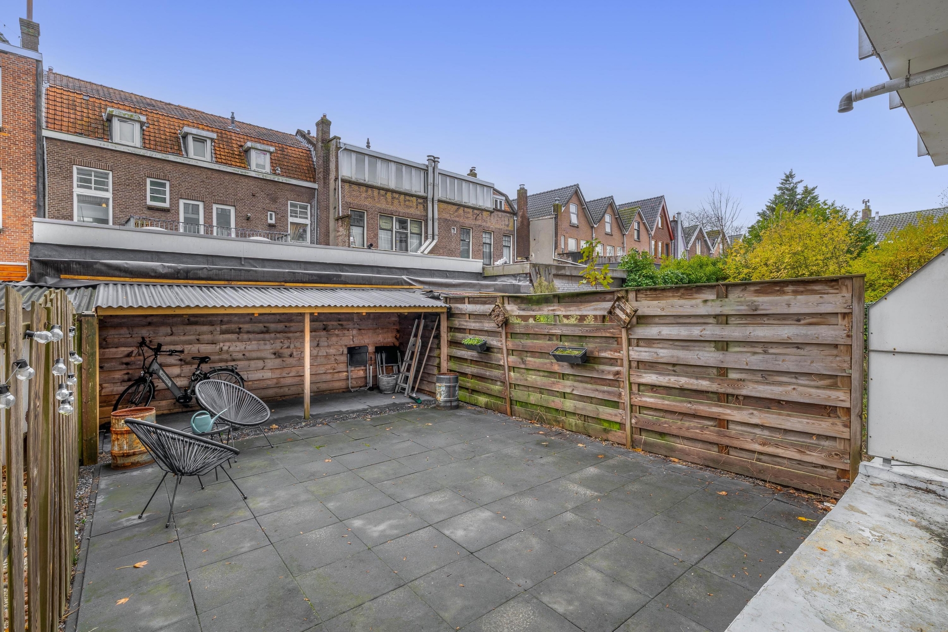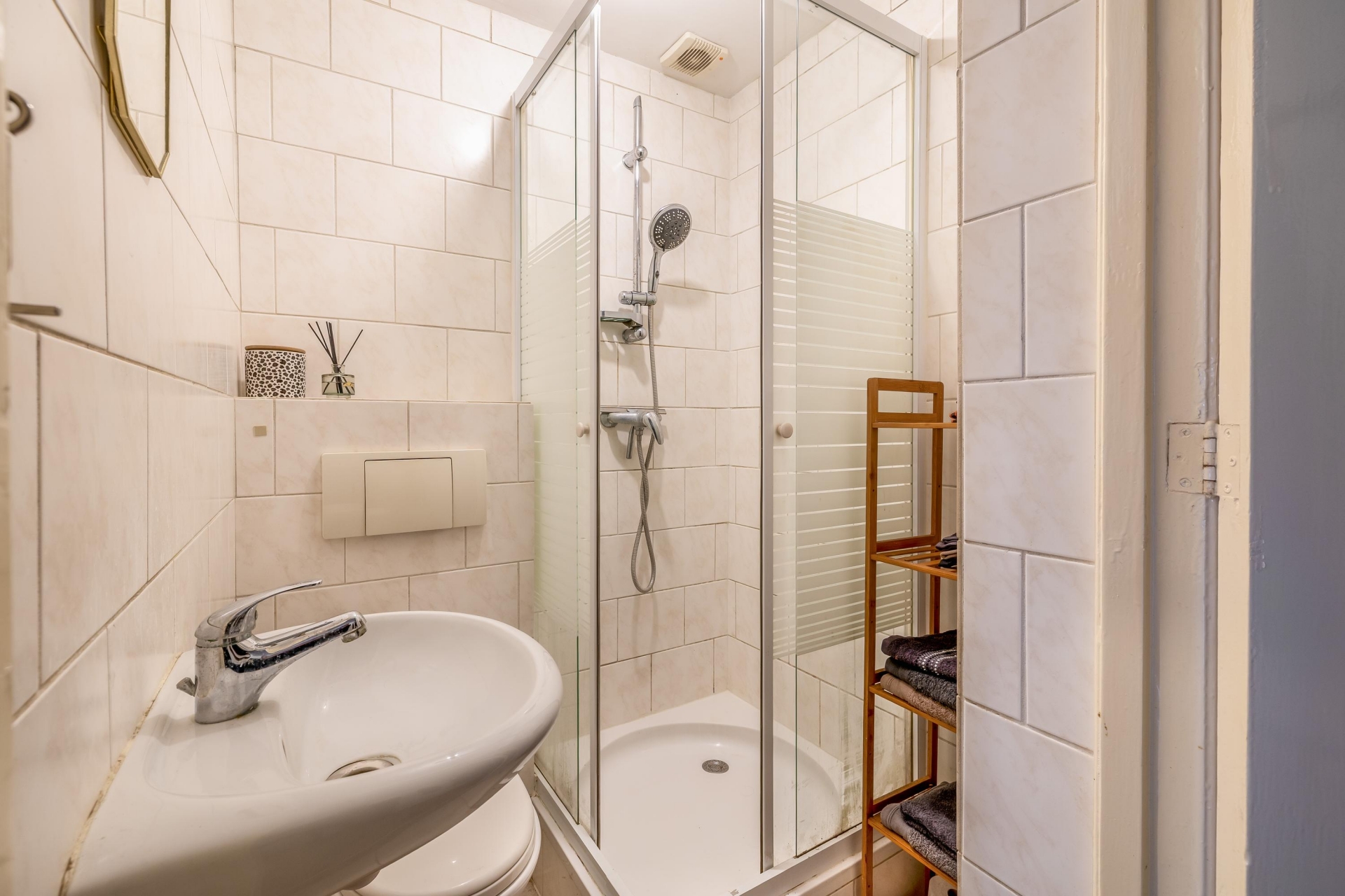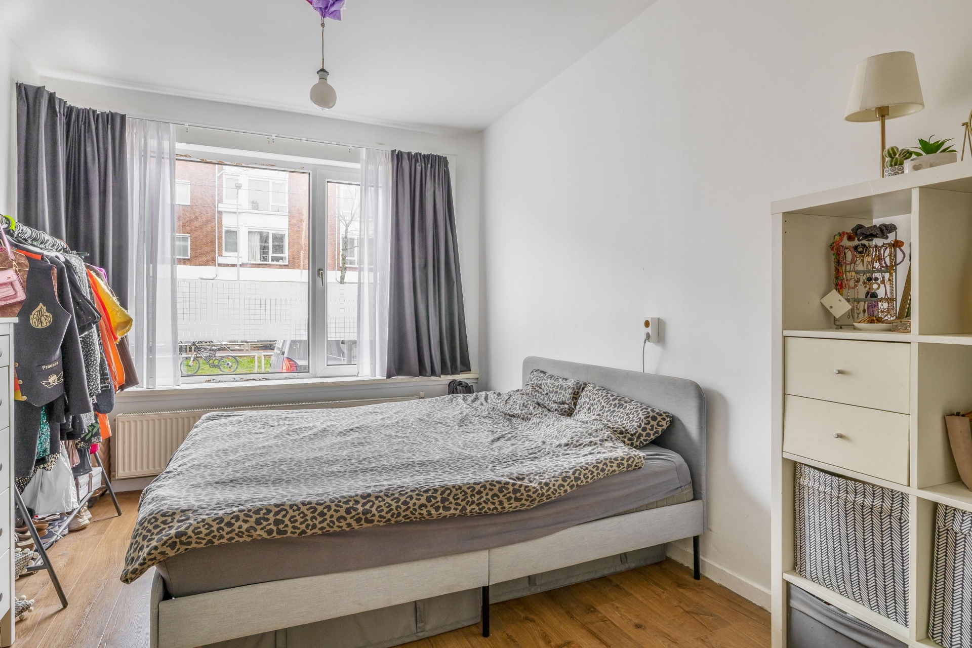 De slaapkamer ligt aan de voorzijde en biedt voldoende plek voor een tweepersoonsbed en een kledingkast. Dankzij de karaktervolle glas-in-lood deuren die doorlopen vanuit de woonkamer, blijft ook deze ruimte licht en sfeervol. De badkamer is compact maar functioneel, met een douche, wastafel en toilet. De badkamer is praktisch van opzet en netjes onderhouden. Hier heb je als koper de mogelijkheid jouw eigen stempel te drukken op de woning, maar valt ook in de huidige staat direct te gebruiken.