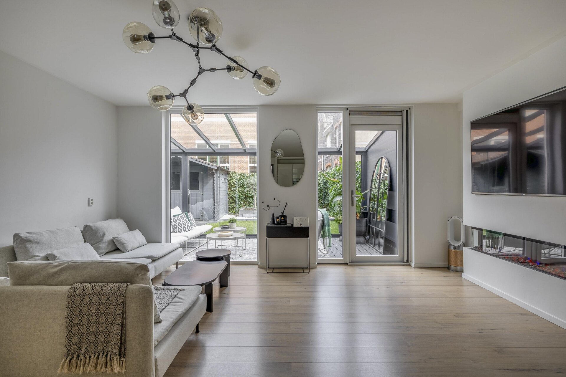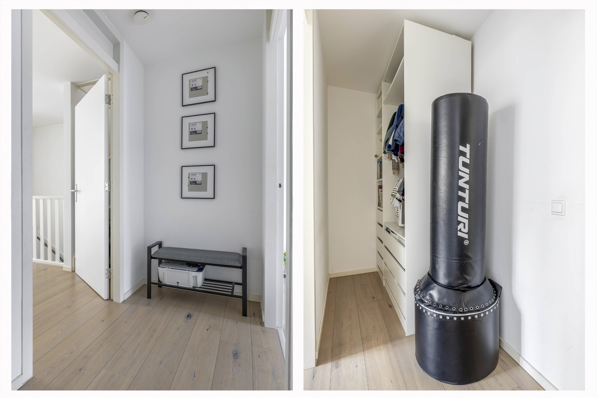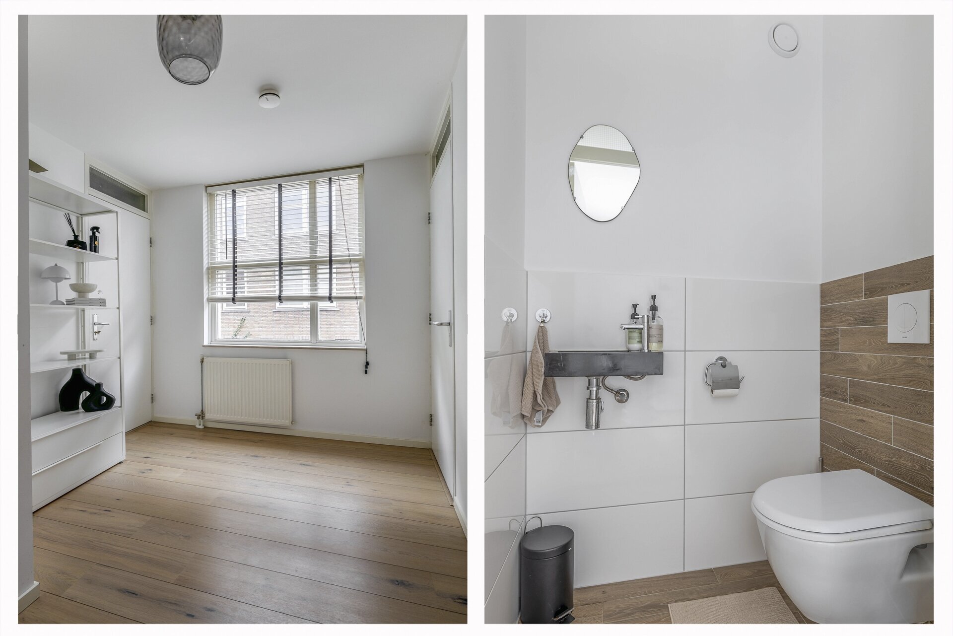De eerste verdieping telt twee goed bemeten slaapkamers met laminaatvloeren en veel lichtinval. De badkamer is modern en uitgerust met een inloopdouche, wastafelmeubel, designradiator en luxe betegeling. Daarnaast is er een separaat tweede toilet en een aparte ruimte voor de wasmachine en cv-installatie.