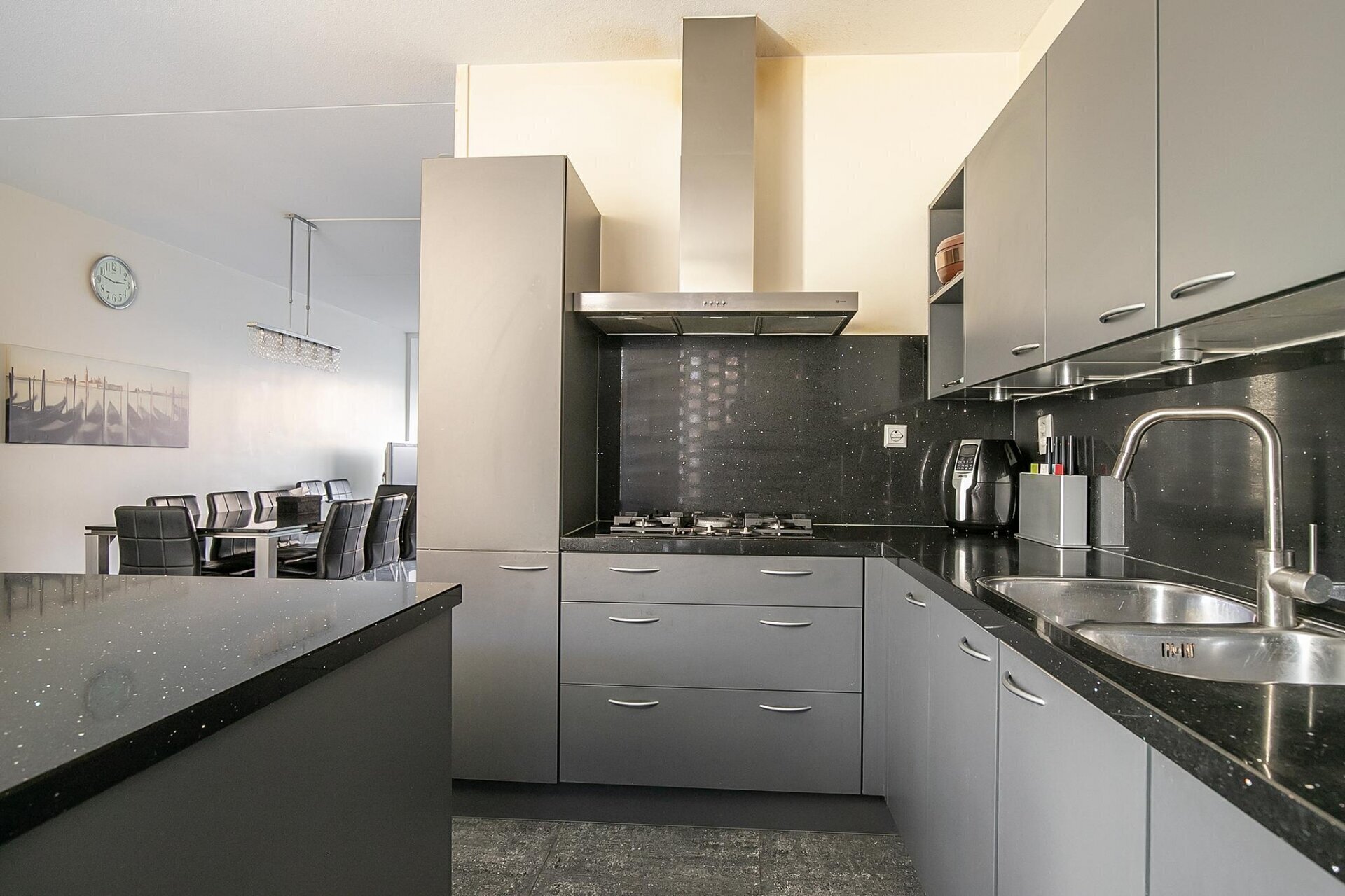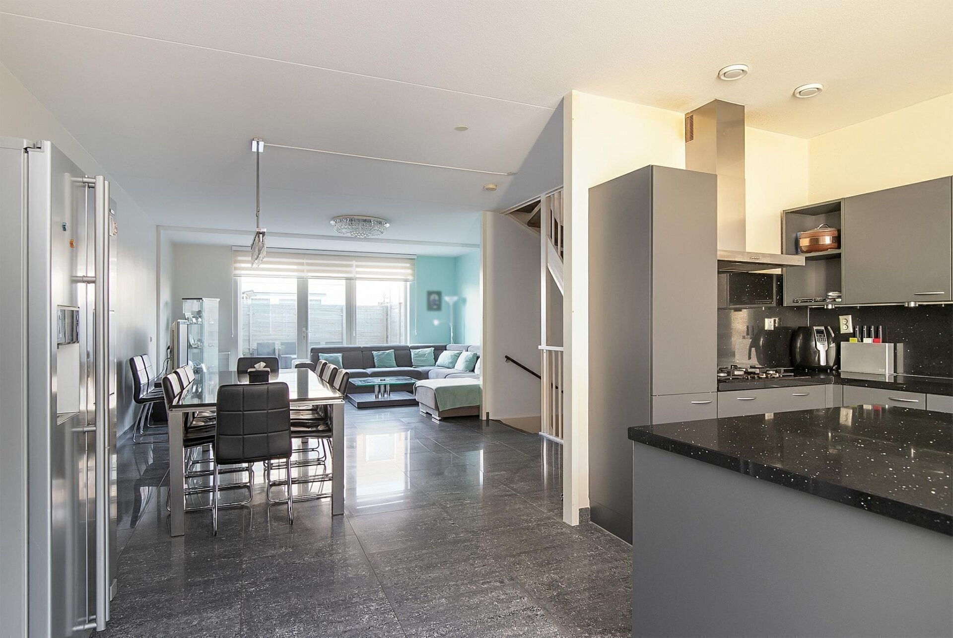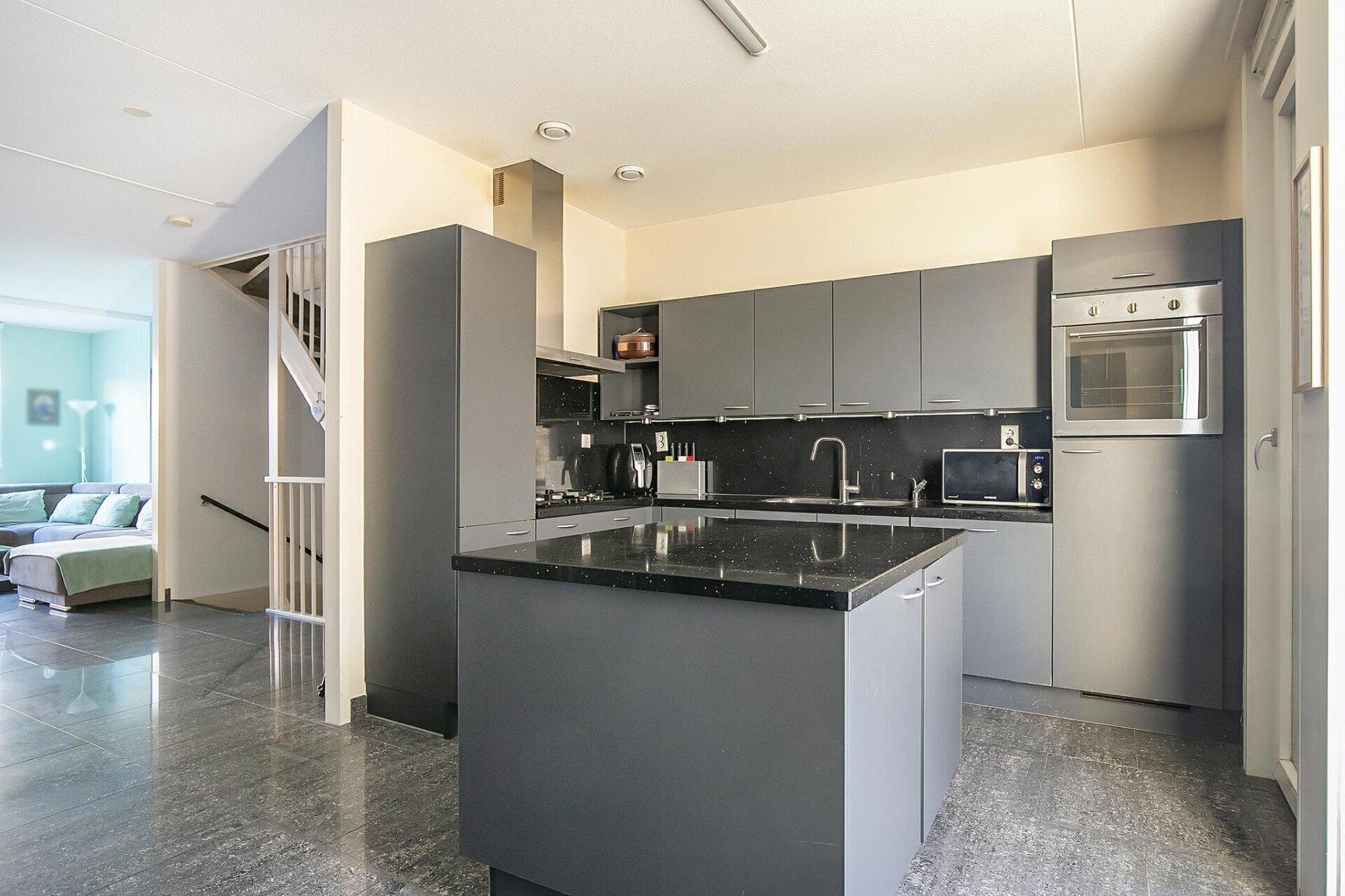 De lichte woonkamer is zeer ruim en biedt toegang tot het zonnige terras op het zuid-oosten. Het terras behoeft weinig onderhoud en is ruim 35 M² groot. De open woonkeuken is gelegen aan de voorzijde en is voorzien van een keukeneiland, 5-pits gaskookplaat, afzuigkap, vaatwasser, oven en voldoende kastruimte. De erker is sfeerbepalend en biedt extra daglicht.