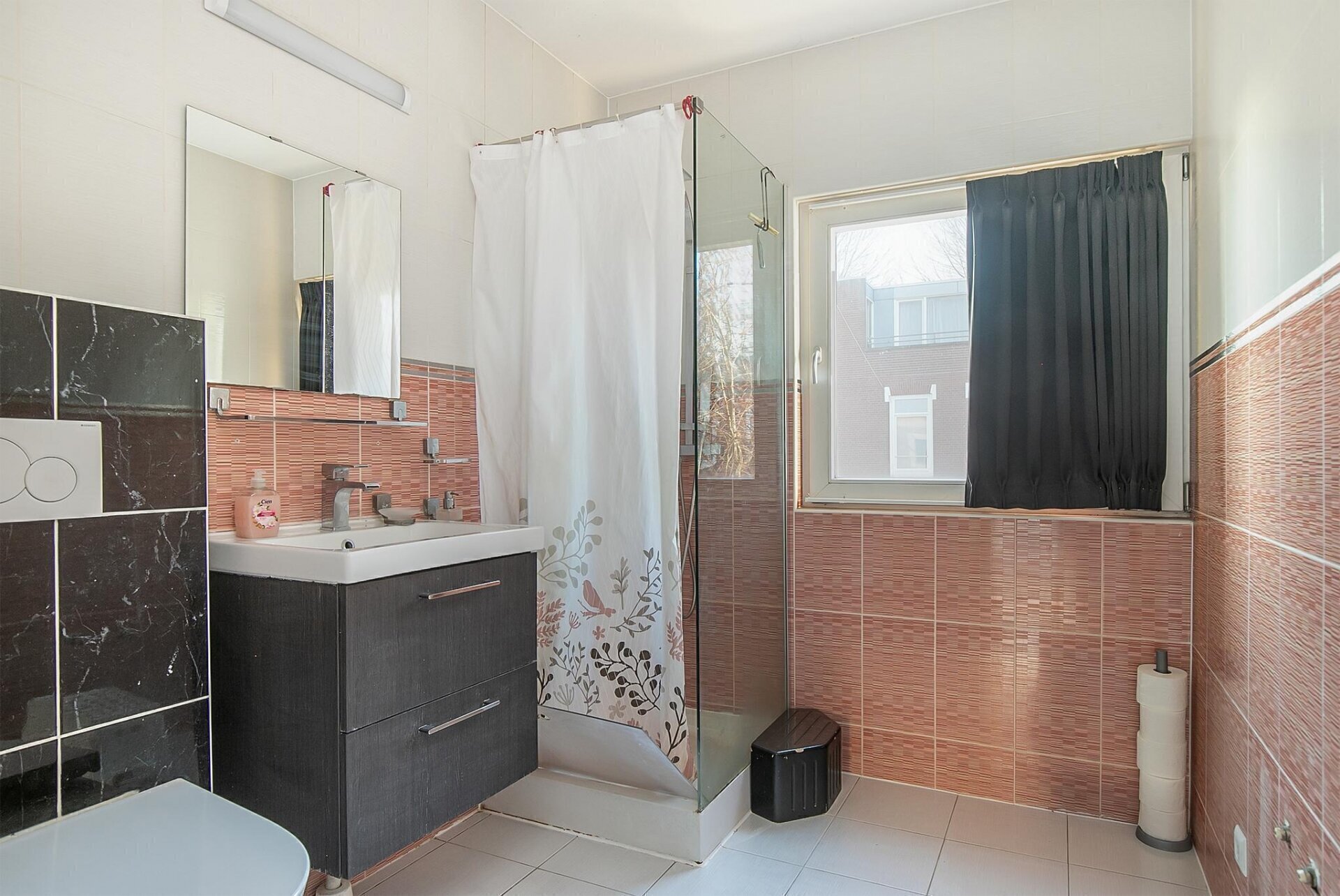 De tweede verdieping heeft twee slaapkamers aan de achterzijde en één slaapkamer aan de voorzijde. Één van de slaapkamers aan de achterzijde bevat op maat gemaakte schuifdeuren, waar veel kastruimte gecreëerd kan worden. De volledig betegelde badkamer is voorzien van een douche, wastafel met meubel, designradiator en toilet met handdouche. Tevens is er een aansluiting voor een bad aanwezig.