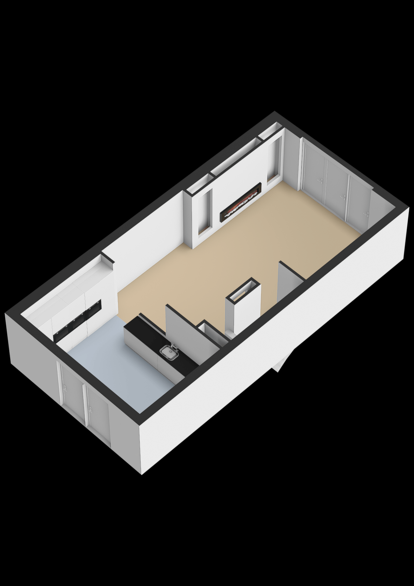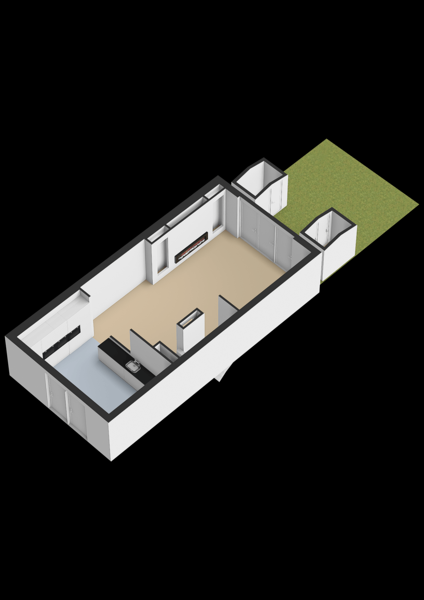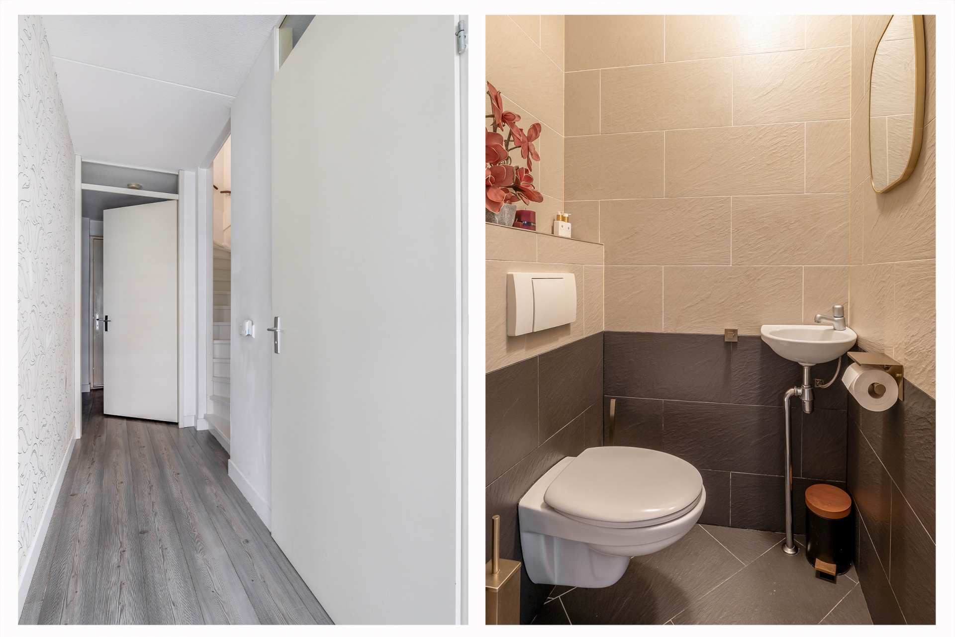 Op de begane grond vind je één slaapkamer, ideaal als logeerkamer, werkkamer of praktijkruimte. In de hal bevinden zich het toilet met handdouche, een ruime berging met wasmachineaansluiting en de toegang tot de garage. De parkeerplaatsen liggen direct achter de woning, je stapt dus letterlijk droog en snel naar binnen.
