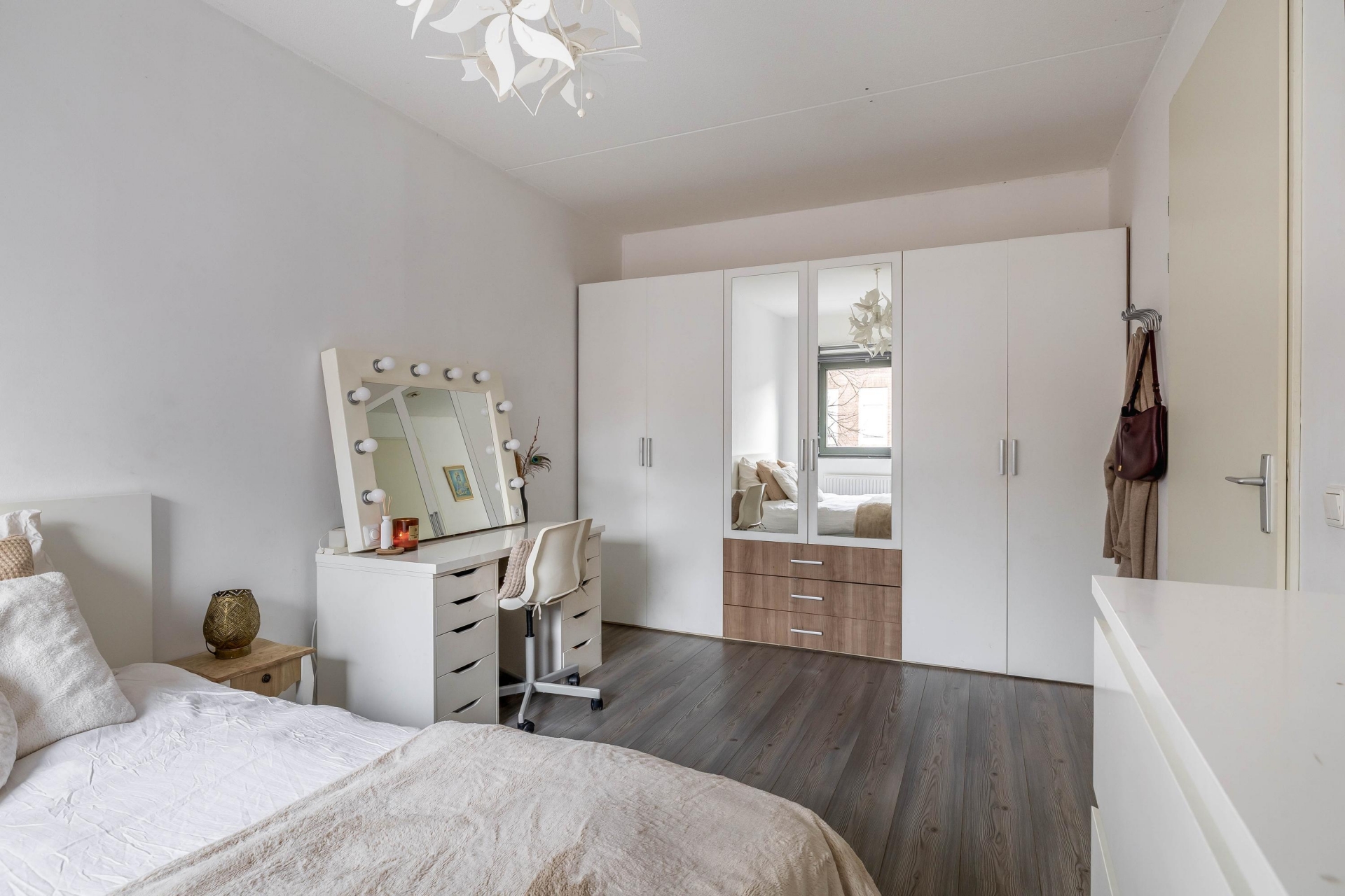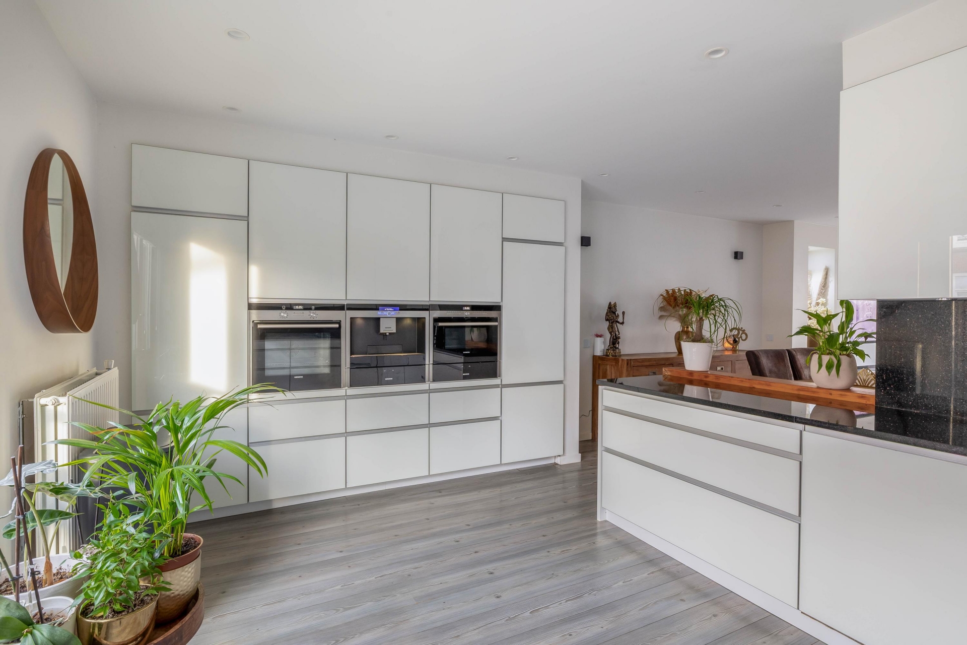 De eerste verdieping is ingericht als leefverdieping met een royale woonkamer en veel daglicht. De openslaande deuren leiden naar het ruime terras. De moderne keuken (2021) aan de voorzijde is voorzien van een natuurstenen blad, inductiekookplaat, afzuigkap, vaatwasser, oven en veel opbergruimte.