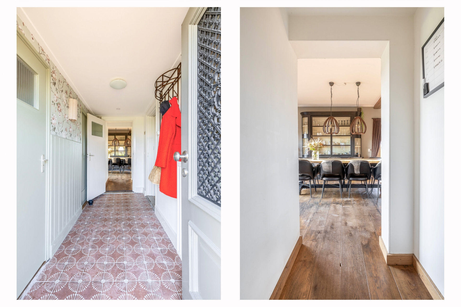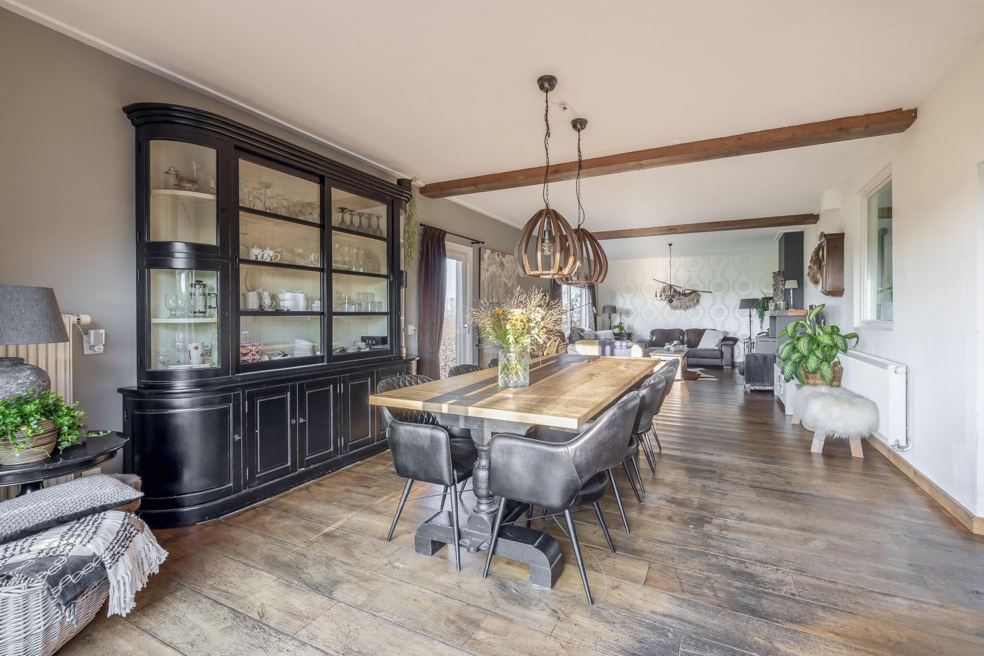 Bij binnenkomst valt direct de warme sfeer op. De gezellige woonkamer is voorzien van houten vloeren, een houtkachel en grote ramen die uitkijken over de landerijen. Aan de achterzijde is de woonkamer uitgebouwd; deze uitbreiding is direct op fundering geplaatst met oog op een toekomstige opbouw, waardoor er in de toekomst eenvoudig extra woonruimte op de verdieping kan worden gerealiseerd. Aan de rechterzijde vind je een royale zithoek, terwijl links ruimte is voor een grote eettafel met toegang tot de veranda. De afgesloten keuken heeft een landelijke uitstraling, veel opbergruimte en een groot fornuis met oven. Aangrenzend bevindt zich de praktische bijkeuken met ruimte voor wasmachine, voorraad en extra bergruimte. Daarnaast zijn er een aparte entreehal en toiletruimte aanwezig. Op de begane grond ligt tevens een ruime slaapkamer, ideaal voor gelijkvloers wonen of als werk-/praktijkruimte. De eerste verdieping telt twee fijne slaapkamers met vaste kastruimte. De badkamer is ruim en licht, voorzien van een ligbad, aparte douche, wastafel en tweede toilet. Een bergvliering biedt extra opbergruimte.